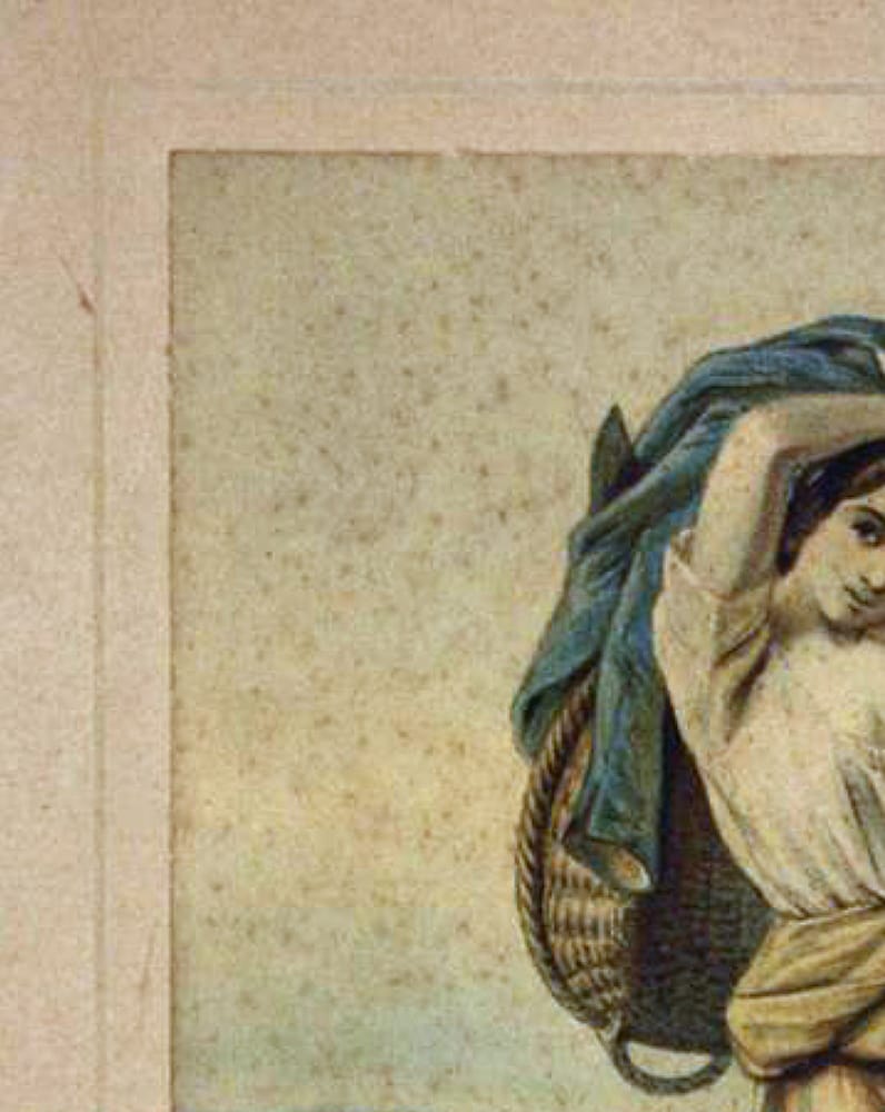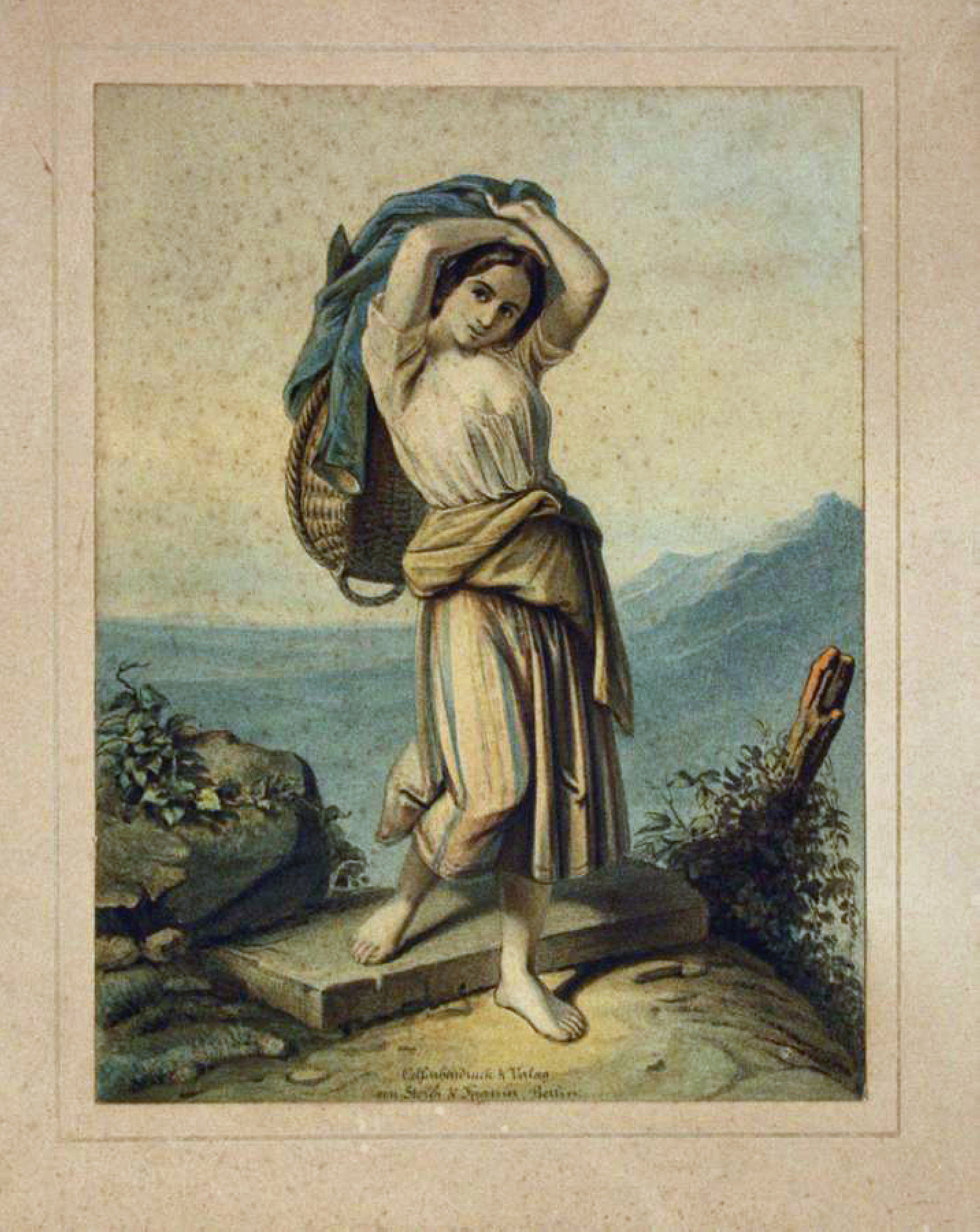 - Description: Oil colour print by Adolf Eybel, inscribed in the picture: “Oelfarbendruck & Verlag von Storch & Kramer, Berlin.”, below: ” Der Morgen Gem. by Ad. Eybel”. The artist shows the morning in the shape of a young woman carrying a large basket on her back. She is standing on a hill, a mountain landscape spreads out blue behind her. Adolf Eybel (Berlin 1808 – Berlin 1882) was a German painter and lithographer.