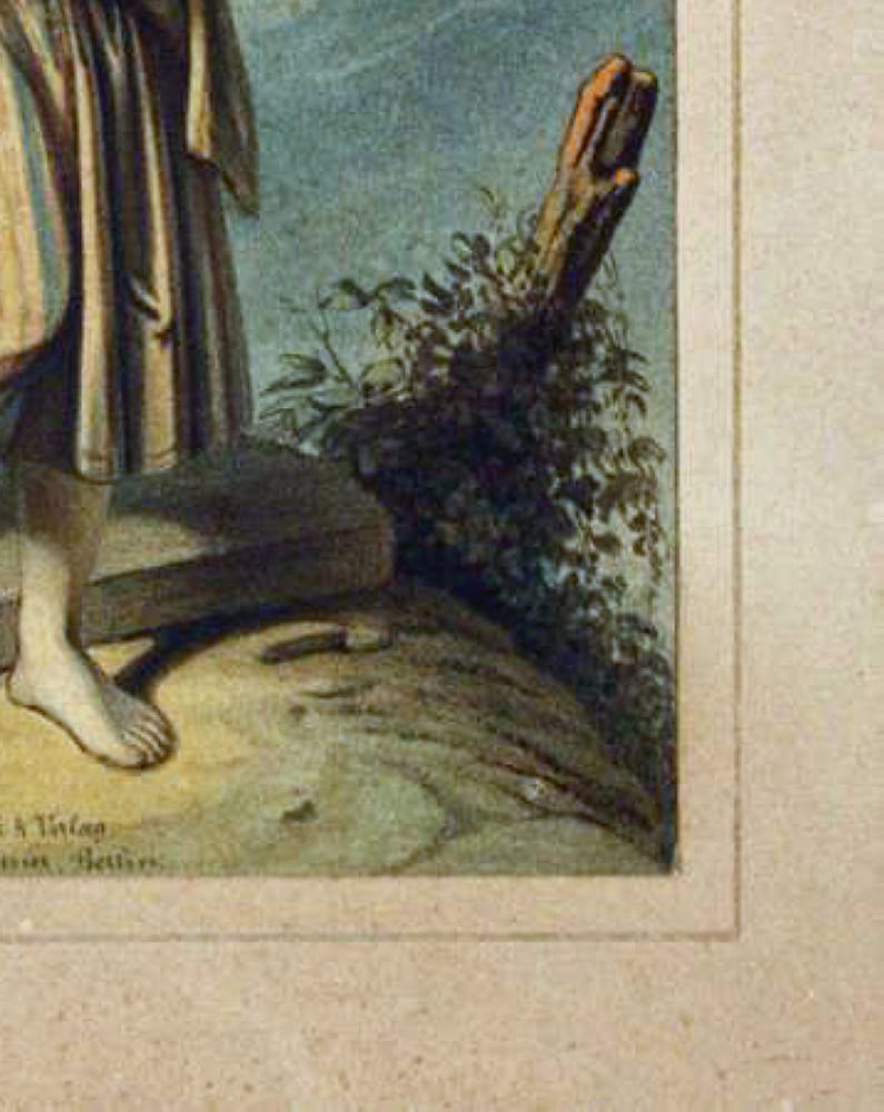 - Beschreibung: Ölfarbendruck von Adolf Eybel, bezeichnet im Bild: “Oelfarbendruck & Verlag von Storch & Kramer, Berlin.”, darunter: ” Der Morgen Gem. von Ad. Eybel”. Der Künstler zeigt den Morgen in Gestalt einer jungen Frau, die einen großen Korb auf dem Rücken trägt. Sie steht auf einer Anhöhe, blau breitet sich hinter ihr eine Berglandschaft aus. Adolf Eybel (Berlin 1808 – Berlin 1882) war ein deutscher Maler und Lithograph.