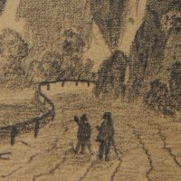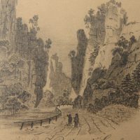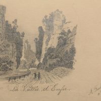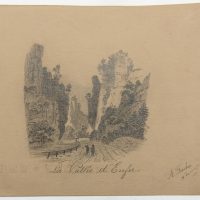 - Beschreibung: Malerische Landschaftsskizze eines tief eingeschnittenen Tals mit steil aufragenden Felsen. Im Vordergrund sind die Silhouetten zweier Wanderer zu sehen, die auf einer Straße durch das Tal entlanggehen und den Anblick bestaunen. | Wasserzeichen: “LES-ANNONAY”