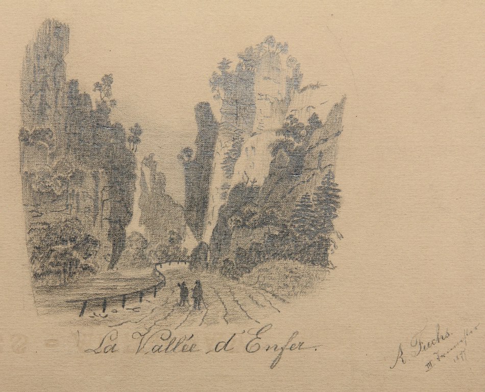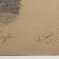 - Bezeichnung: Unterhalb bezeichnet mit “La Vallée d’Enfer”. Darunter ist das Wasserzeichen “LES-ANNONAY” zu erkennen. Rechts unten signiert und datiert mit “A.Fuchs III. September[?] 1877”.