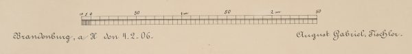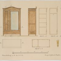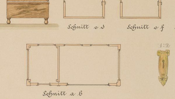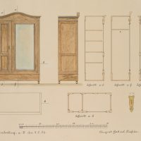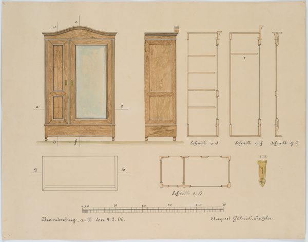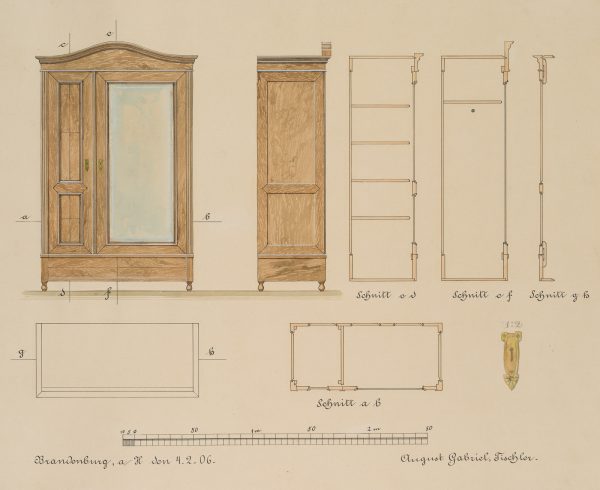 - Beschreibung: Unter der Darstellung signiert und datiert “Brandenburg, den 4.2.06. / August Gabriel, Tischler”. Verschiedene Ansichten des Entwurfs, mit Detailstudie des Schlosses im Verhältnis 1:2.