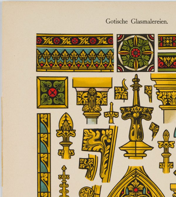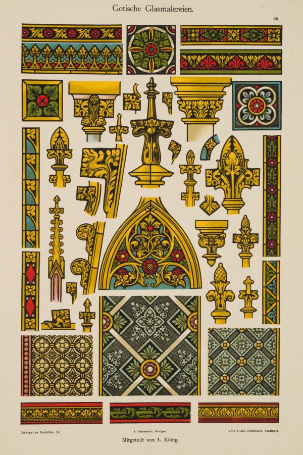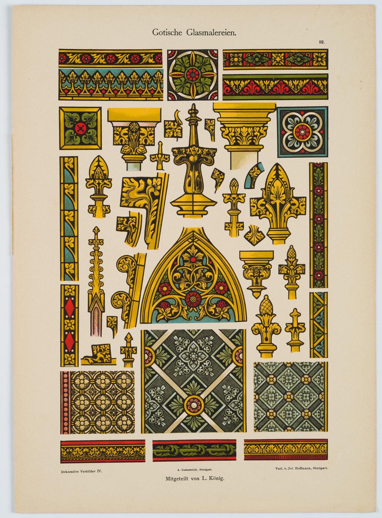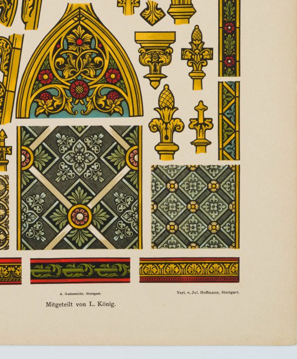 Adam Gatternicht (1819 Heidelberg – 1899 ), Gotische Glasmalereien, Mitgeteilt von L. König, aus: Dekorative Vorbilder IV., Verlag Julius Hoffmann, Stuttgart, um 1900, Farblithographie
