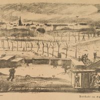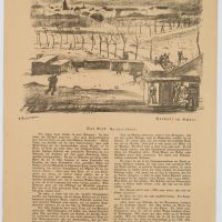 - Beschreibung: Rückseitig die Lithographie: ‘Vorstadt im Schnee’ von Rudolf GROßMANN (1881 Freiburg – 1941 ebd), darunter der Text ‘Das Geld’ von Hans Ostwald. Die Radierungen sind jeweils mittig unten betitelt und rechts unten signiert sowie datiert. Über die Zeitschrift ‘Kriegszeit’: Im August 1914 begann der Paul Cassirer Verlag mit der Herausgabe der Kriegszeit, einer wöchentlichen, vierseitigen Publikation über künstlerische Reaktionen auf den Ersten Weltkrieg. Die meisten der im Magazin vertretenen Künstler gehörten der Berliner Secession an. Zunächst begrüßten die Kriegszeit-Mitarbeiter den Krieg mit Begeisterung und hatten Vertrauen in das Militär unter Wilhelm II. und den Glauben an die Gerechtigkeit der Deutschen. Dieser Grundströmung folgte aber schon bald die Ernüchterung, die ihren Niederschlag in veränderten Themen fand. Statt patriotisch begeisterter Soldaten in Kampfszenen erschienen schon bald eskapistische, mit kritischen Untertönen versehene Bildwerke mit teils pazifistische Ansätzen.