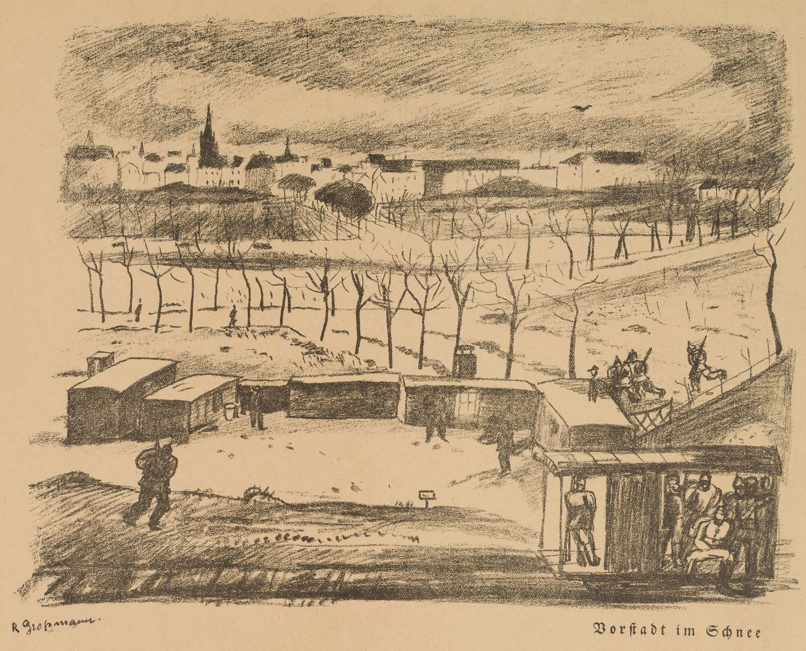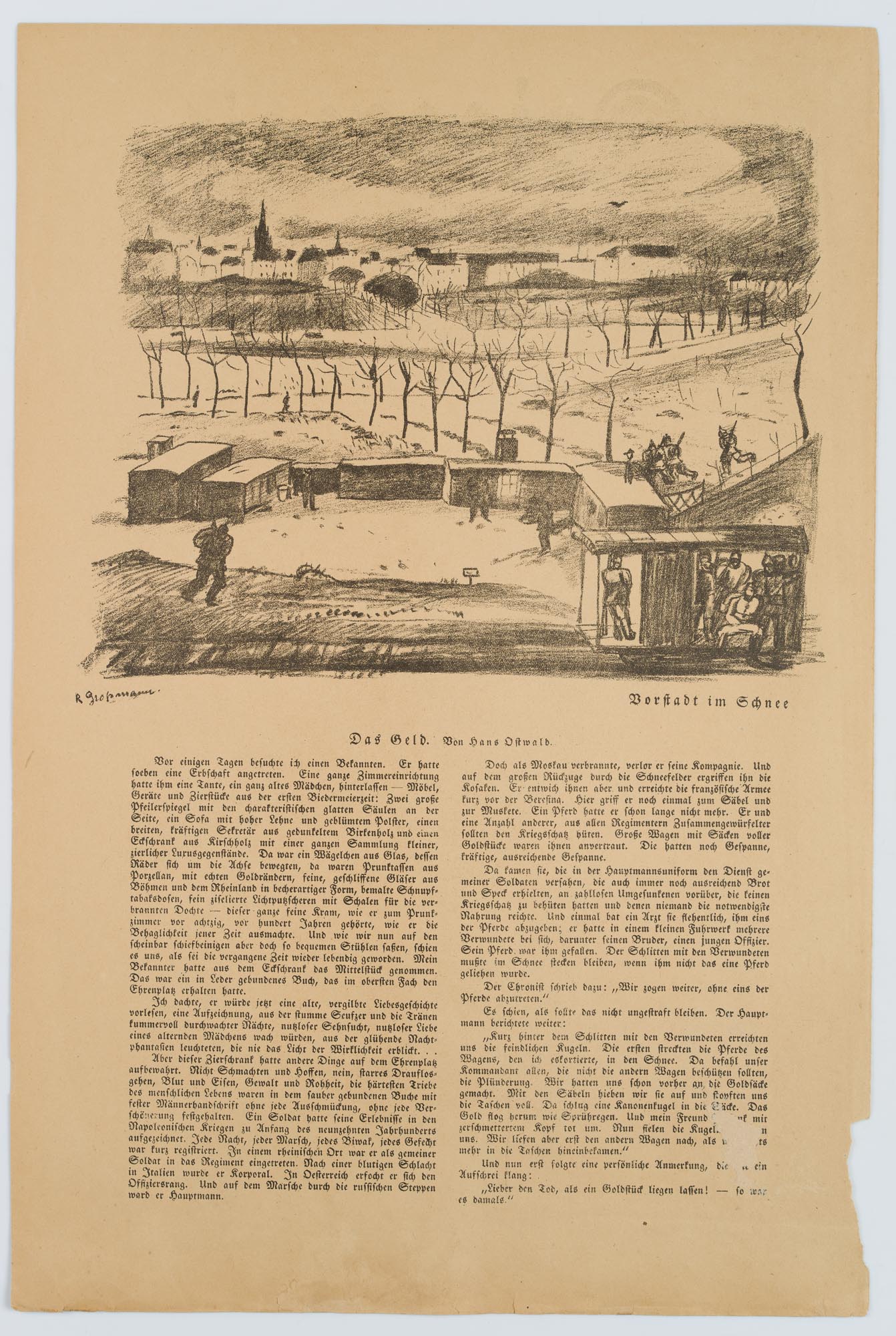 - Description: On the reverse the lithograph: ‘Vorstadt im Schnee’ by Rudolf GROßMANN (1881 Freiburg – 1941 ibid), below the text ‘Das Geld’ by Hans Ostwald. The etchings are each titled in the lower centre and signed and dated in the lower right. About the magazine ‘Kriegszeit’: In August 1914, the Paul Cassirer Verlag began publishing Kriegszeit, a weekly, four-page publication on artistic reactions to the First World War. Most of the artists represented in the magazine belonged to the Berlin Secession. At first, the Kriegszeit contributors greeted the war with enthusiasm and had faith in the military under Wilhelm II and belief in the righteousness of the Germans. However, this basic current was soon followed by disillusionment, which found expression in changed themes. Instead of patriotically enthusiastic soldiers in battle scenes, escapist pictorial works with critical undertones and partly pacifist approaches soon appeared.