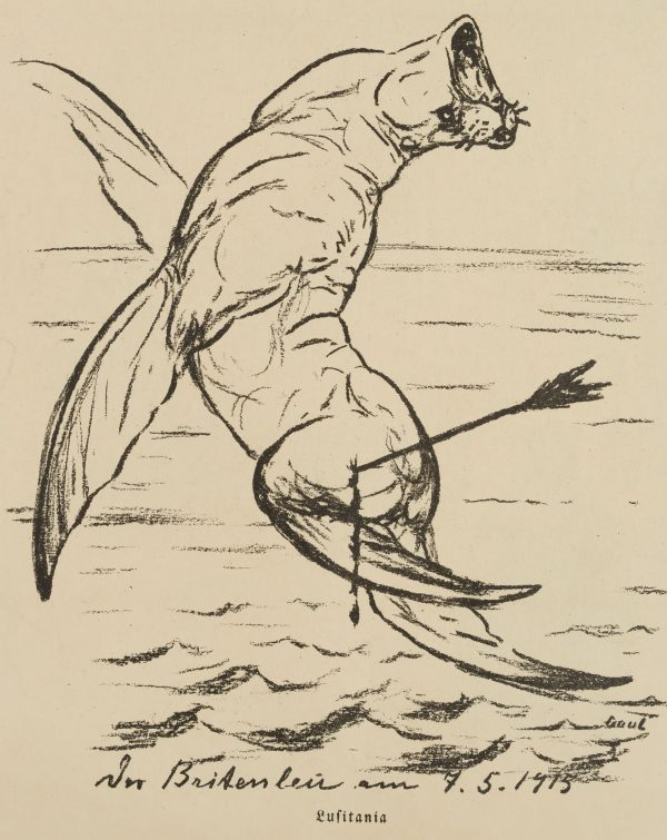August Gaul (1869 Hanau – 1921 Berlin), ‘Lusitania’. Titelblatt zu ‘Kriegszeit – Künstlerflugblätter’, Ausgabe Nr. 39, 12. Mai 1915, hrsg v. Paul Cassirer, 1915, Lithographie
