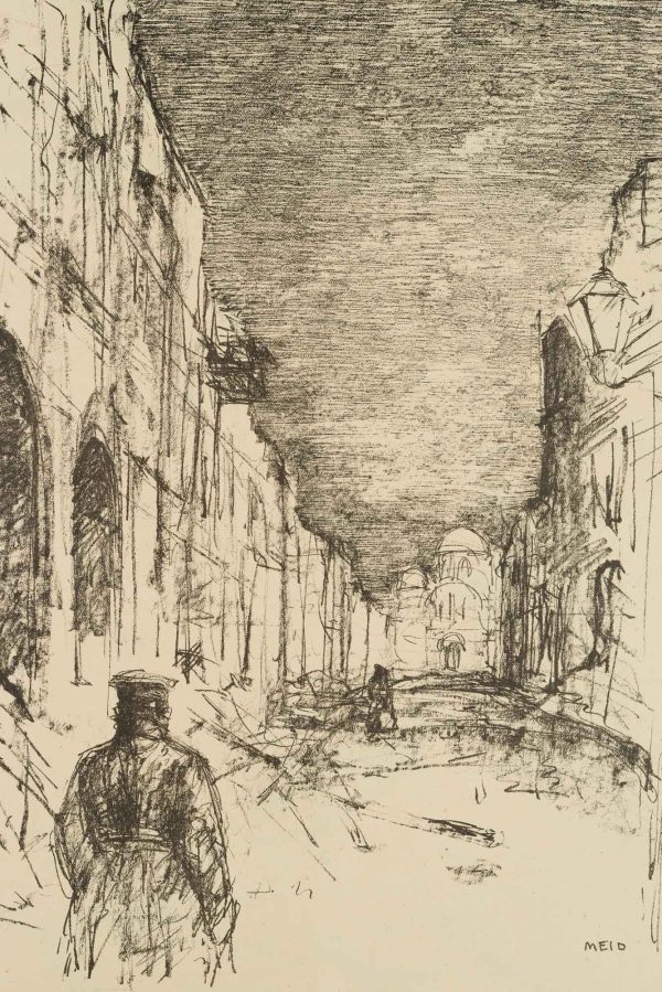 - Description: On the reverse the lithograph: ‘Straße in Kalisch’ by Hans MEID (1883 Pforzheim – 1956 last mention). The etchings are each titled in the lower centre and signed next to it on the right. About the magazine ‘Kriegszeit’: In August 1914, the Paul Cassirer Verlag began publishing Kriegszeit, a weekly, four-page publication on artistic reactions to the First World War. Most of the artists represented in the magazine belonged to the Berlin Secession. At first, the Kriegszeit contributors greeted the war with enthusiasm and had faith in the military under Wilhelm II and belief in the righteousness of the Germans. However, this basic current was soon followed by disillusionment, which found expression in changed themes. Instead of patriotically enthusiastic soldiers in battle scenes, escapist pictorial works with critical undertones and partly pacifist approaches soon appeared.