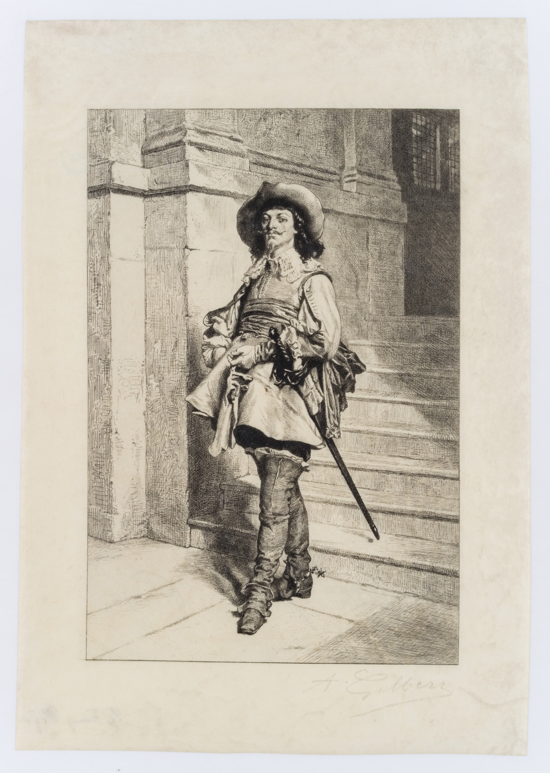 - Description: Full-length depiction of a man in the historical costume of a cavalier in high riding boots and with rapier. He holds the right glove loosely in his hand, as if to demand satisfaction through a duel.