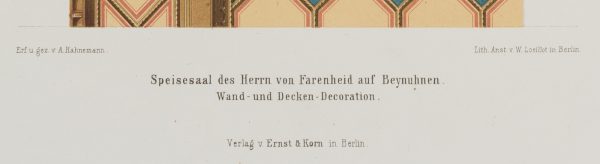 - Description: Signed “Erf. U. gez. V. A.Hahnemann / Lith. Anst. v.W. Loeillot in Berlin.”. Titled below. Below: Publisher Ernst & Korn in Berlin.
