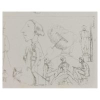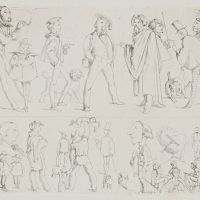 - Beschreibung: Bereits in jungen Jahren regte sich in dem jungen Albert Hendschel das Zeichentalent. Eine treffend ausgeführte Karikatur des Gymnasiallehrers überzeugte dann sogar den Vater, die künstlerische Laufbahn des Jungen zu fördern. Hendschel studierte sodann ab 1847 an der Städelschule und war dort seit 1851 bei Jakob Becker eingeschrieben. Auf unseren beiden wunderbaren Karikaturen stellt er auf dem ersten Blatt in der oberen Reihe von links nach rechts seine Mitschüler in der Klasse von Jakob Becker am Städelschen Kunstinstitut dar: Otto Scholderer (1834-1902), Julius Hamel (1834-1907), Louis Lang (1824- 1886), Karl Bernhard Schlösser (1832-nach 1914), Karl Harveng (1832-1874) und einen gewisser Nehrlich, über den allerdings keine weiteren Informationen vorliegen. Im zweiten Blatt finden sich nun nicht nur Akademieschüler: Die erste Reihe beginnt links mit zwei Figuren, die nicht identifiziert sind. Dann folgen als Mitstreiter der Akademie der Architekt Friedrich Wilhelm Ludwig (geboren 1828) und die Maler Karl Freiberger (1831-1855) und Leopold Bode (1831-1906). Die nächste Figur ist rückseitig als E. Hallenstein identifiziert, der zumindest als Künstler bei Jakob Becker nicht erwähnt ist. Dann folgt Carl Hessemer (1853-1944), bei dem es sich um den Sohn des ebenfalls an der Kunstakademie lehrenden Friedrich Maximilian Hessemer handelt. Der letzte Künstler im oberen Bunde ist Victor Lorie (1835-1912). Darunter folgen als Porträt links Johann Heinrich Hasselhorst (1825- 1904), Ernst Schalck (1827-1865), Philipp Winterwerb (1827-1873), Adolf Schreyer (1828-1899) und Peter Becker (1828-1904). Unsere beiden Blätter sind ein sprechendes Zeugnis von Hendschels meisterhaft verkürzter und dafür umso treffenderer Linienführung und der messerscharfen Charakterisierung seiner Mitmenschen. Ob es sich bei den Darstellungen in der unteren Reihe (besonders des ersten Blattes) um verschlüsselte Attribute zu den Künstlerfreunden handelt, wie teils vermutet wird, muss vorerst ungeklärt bleiben. Die kleine Dame in der Mitte auf dem ersten Blatt ist rückseitig mit „Erlangerin“ bezeichnet. Auch bei den anderen Darstellungen dürfte es sich eher um spontane Einfälle handeln, teils aus dem Alltag, teils aus dem Akademieleben. Doch auch hier macht die Fähigkeit Hendschels, Typen mit wenigen Linien treffend zu charakterisieren, staunen.