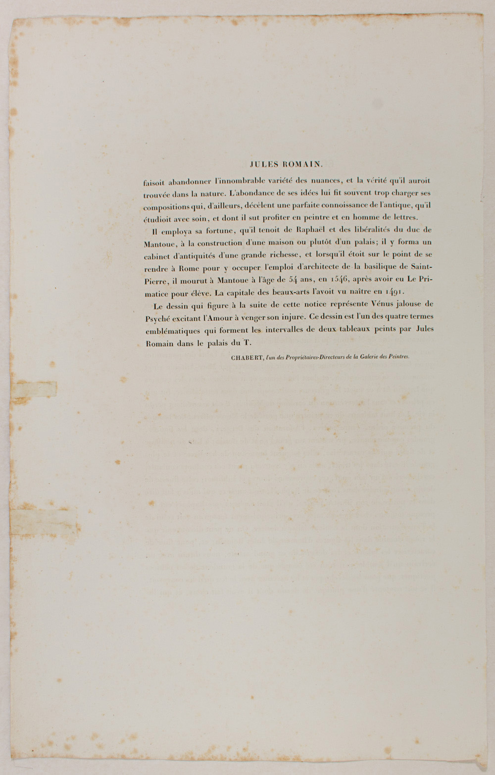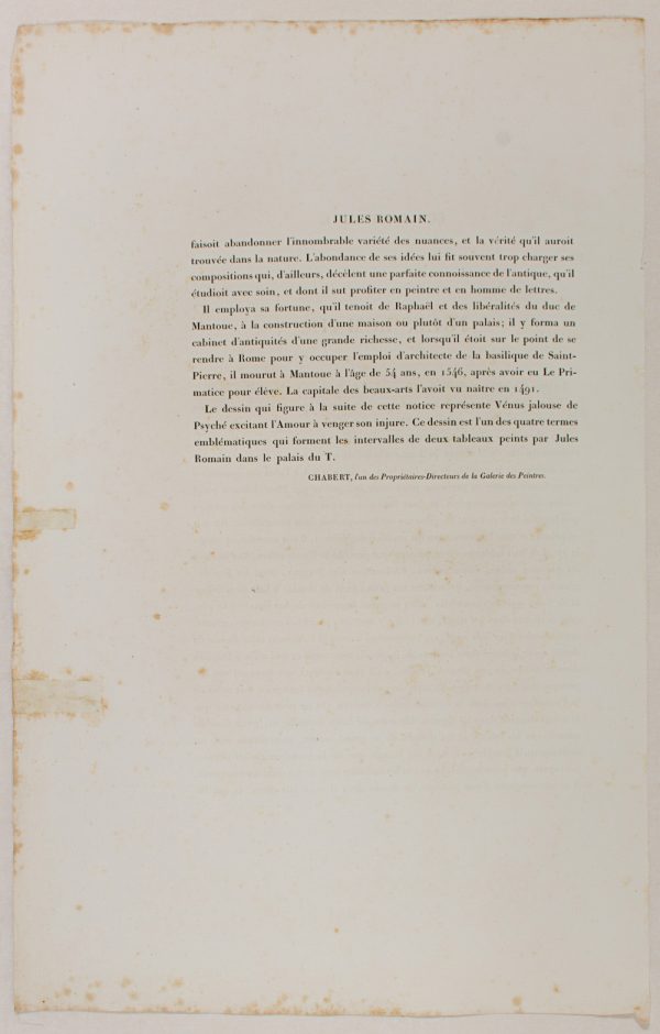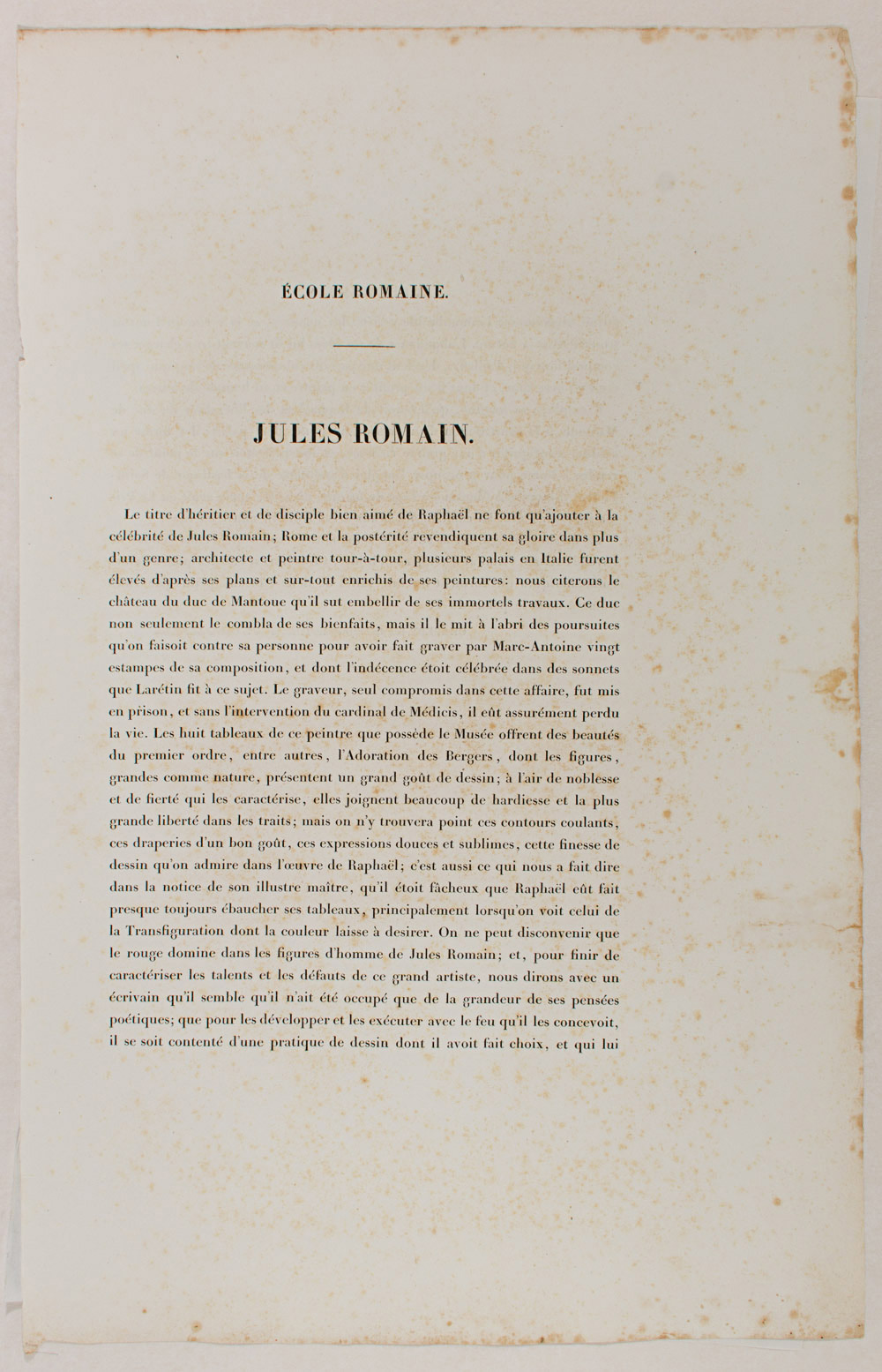 - Description: Portrait: Jules Romain (1499-1546), painter of the Romanesque School. Colour lithograph. Signed: Hesse 1823. Inscribed: 1. lith. de Delpeche. Separate text information (In French by Chabert).