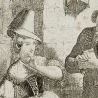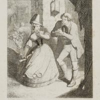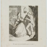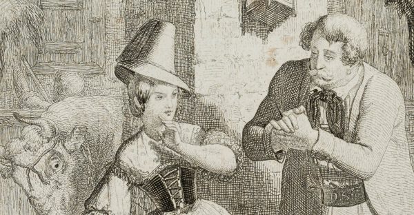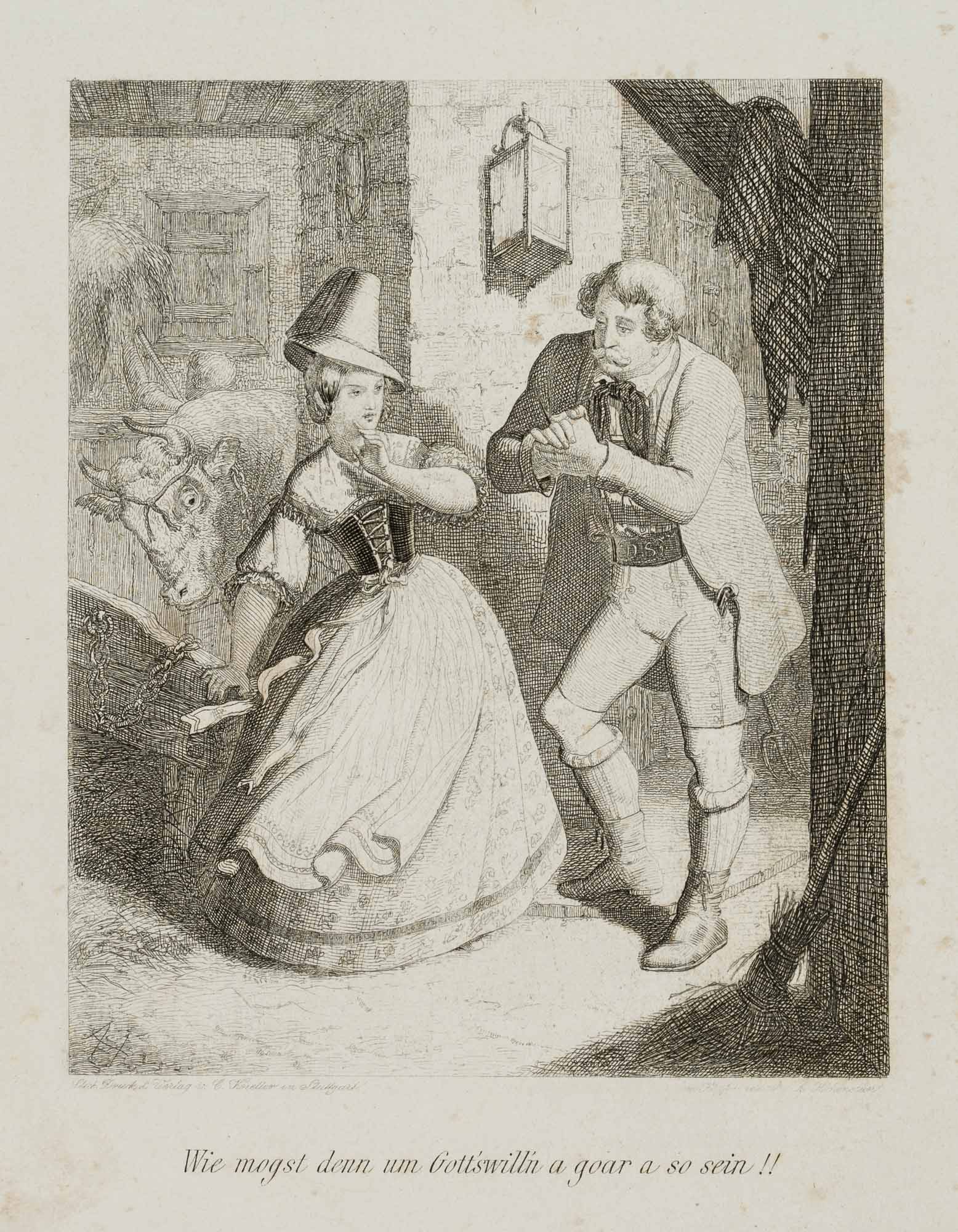 Anton Hohenstein (1823 Bavaria – 1867 Philadelphia), The re-enactment with a young dairymaid and a young man in the cowshed, 1853, Etching
