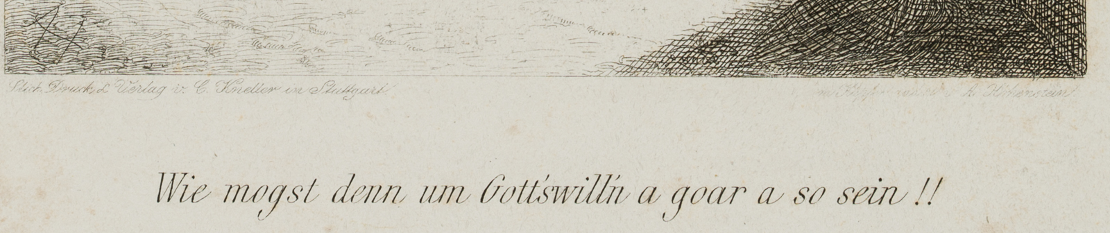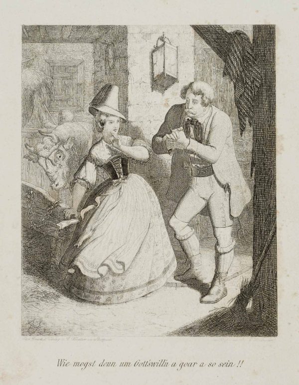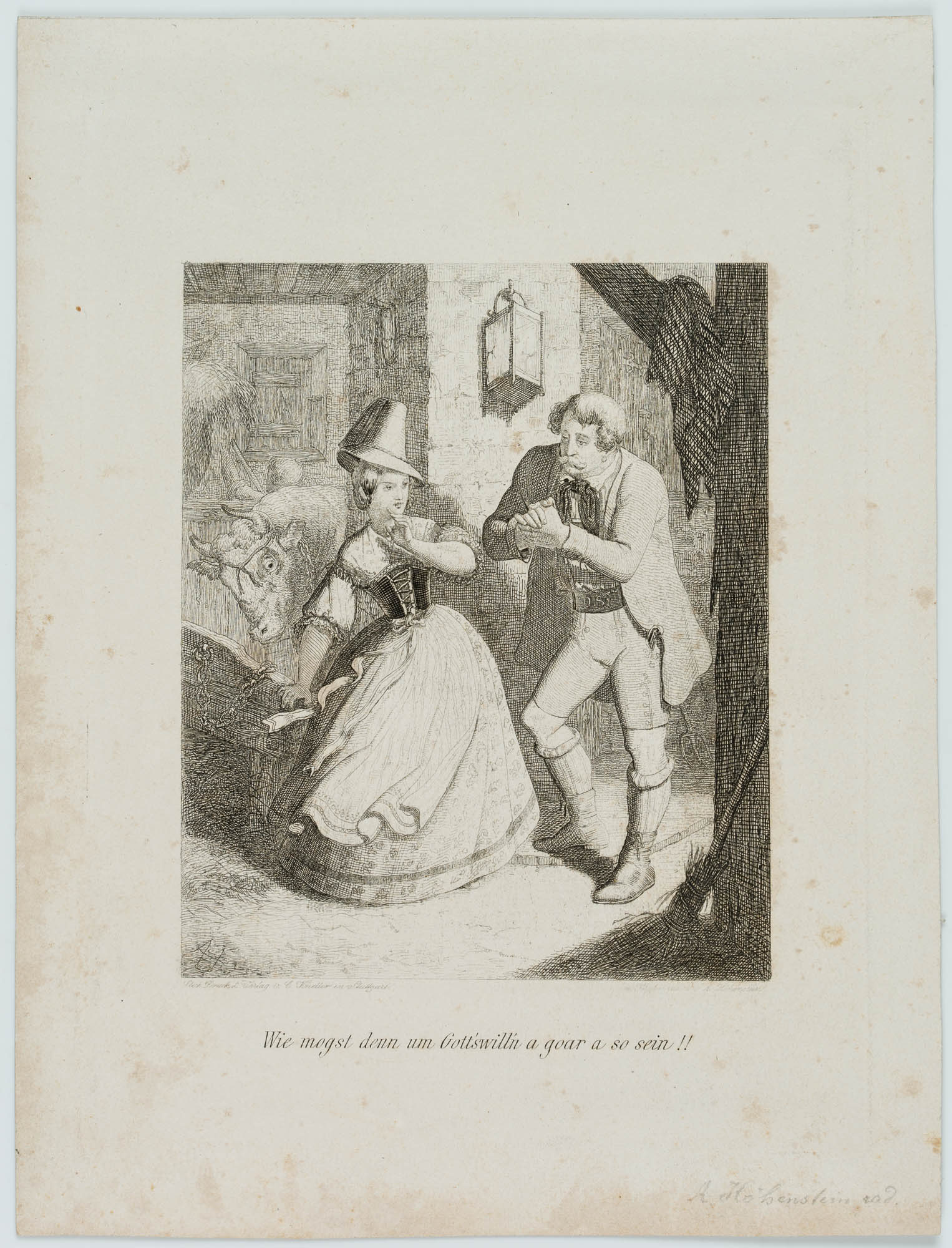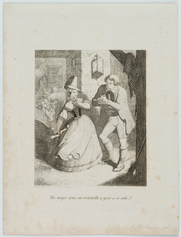 - Inscription: Monogrammed lower left in the image: “AH”. Signed and inscribed below the image in the printing plate: “Stich, Druck & Verlag v. Kneller in Stuttgart / A. Hohenstein”; titled below: “Wie mogst denn um Gottswill’n a goar a so sein!!”, which in German means something like “Zier’ dich nicht so!”. A young man is courting a young dairymaid in the cowshed, but she doesn’t seem to want to return his sympathy. Probably from: “Kunst-und Unterhaltungsblatt für Stadt und Land”.