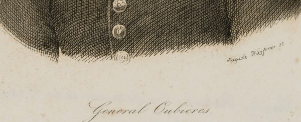 Der vorliegende Stahlstich der deutschen Kupferstecherin und Miniaturmalerin Auguste Hüssener zeigt den französischen General Cubières (1786 Paris – 1853 Paris). Er machte die Feldzüge des Kaiserreichs mit und wurde 1815 Oberst. Auguste Hüssener (*1789/1799 Stettin – 1877 Berlin) wurde für ihre Porträts von Prominenten aus Hochadel, Kunstkreisen, Diplomatie und Wissenschaft bekannt. Einen besonderen Schwerpunkt bildeten die Porträts zeitgenössischer Frauen, wie das der französischen Schauspielerin Rose Chéri. - Datierung: 19. Jahrhundert