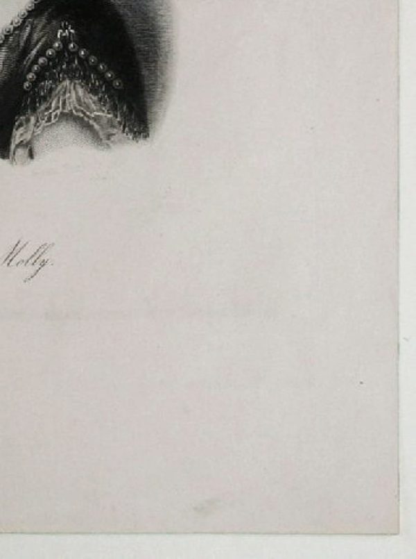 - Beschreibung: Stahlstich von Auguste Hüssner, signiert und datiert (schwer entzifferbar) in der Platte unten rechts, darunter bezeichnet: “Bürgers Molly”. Sehr schönes Porträt einer jungen Frau nach links. Das aufgesteckte Haar und das feine Kleid sind mit Perlenschnüren geschmückt. Auguste Hüssener (Stettin 1789 – Berlin 1877) war deutsche Kupferstecherin und Miniaturmalerin. Sie hatte bei dem Kupferstecher Ludwig Buchhorn gelernt, der Dozent an der Preußischen Akademie der Künste und Leiter der Akademischen Kupferstecherschule war. Hüssener war mit ihren Arbeiten regelmäßig bei den Ausstellungen der Berliner Akademie vertreten. Ihre Porträts bedeutender Zeitgenossen aus dem Hochadel, Kunstkreisen, Diplomatie und Wissenschaft machten sie bekannt. Ihr Hauptaugenmerkt lag dabei auf den Frauen ihrer Zeit.