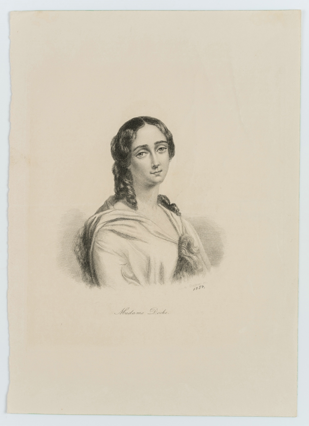 - Bezeichnung: Unten rechts in der Druckplatte vom Künstler signiert, unten mit dem Namen der Dargestellten bezeichnet. In Bleistift auf “1854” datiert.
