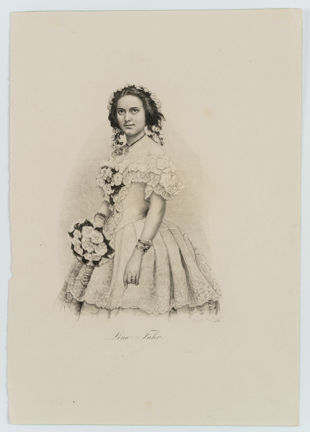 - Bezeichnung: Unten rechts in der Druckplatte vom Künstler signiert, unten mit dem Namen der Dargestellten bezeichnet. In Bleistift auf “1856” datiert.