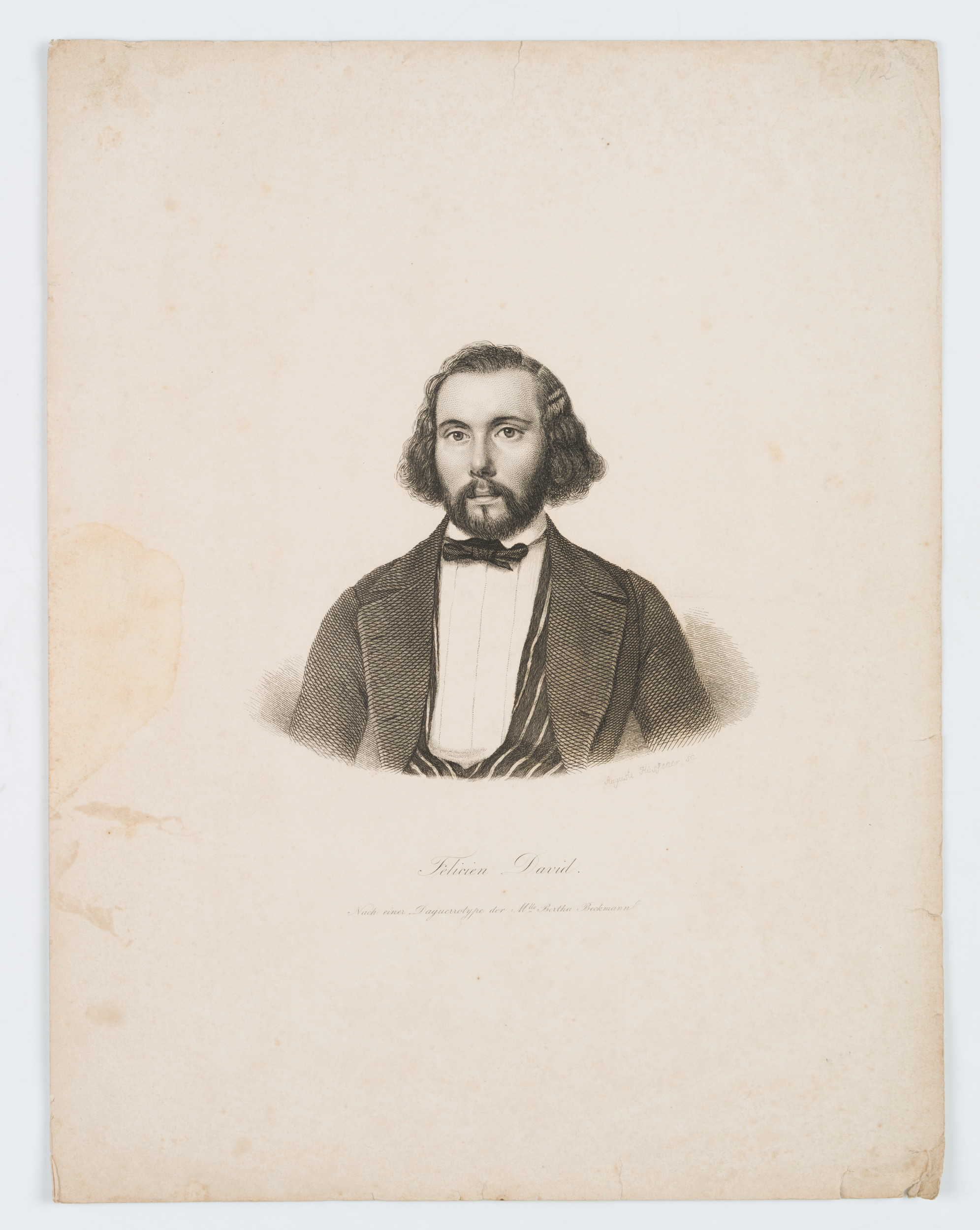 - Bezeichnung: Unten rechts signiert: “Auguste Hüssener sc.”. Unten mittig im Druck bezeichnet: “Felicien David. | Nach einer Daguerrotype der Mlle. Bertha Beckmann”.