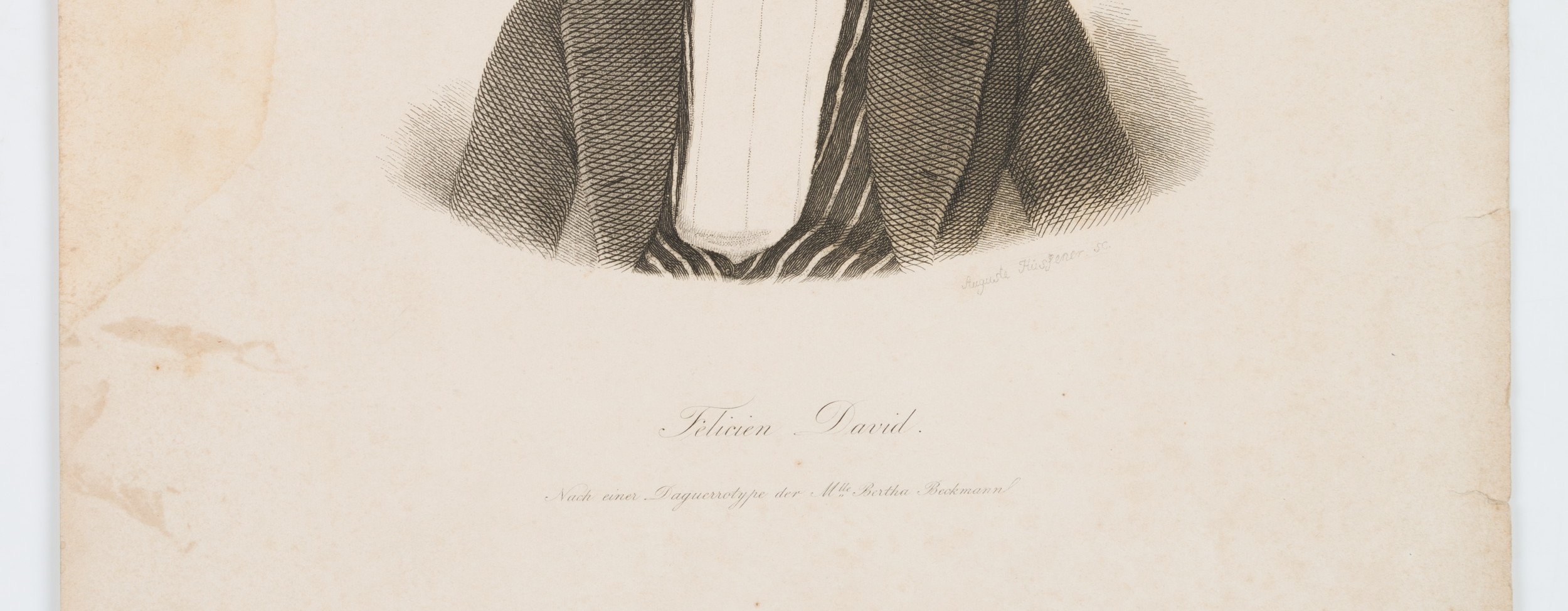 - Inscription: Lower right signed: “Auguste Hüssener sc.”. Lower middle inscribed in the printing plate: “Felicien David. | Nach einer Daguerrotype der Mlle. Bertha Beckmann”.