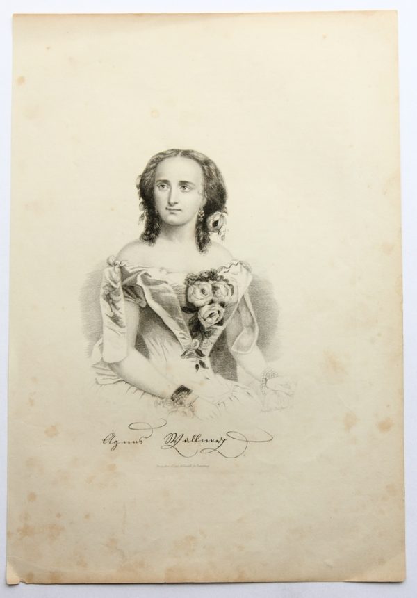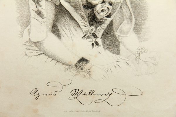 - Bezeichnung: Unterhalb der Darstellung in der Druckplatte vom Künstler signiert “Auguste Hüssener sc.”. Darunter mit faksimiliertem Autogramm der Dargestellten versehen sowie mit “Druck v. Alex Alboth jr. Leipzig” bezeichnet.