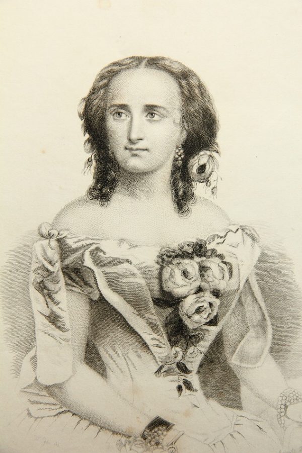- Beschreibung: Halbporträt im Halbprofil der beliebten Schauspielerin in einem mit Rosen geschmückten Kostüm mit eng geschnürter Taille.
