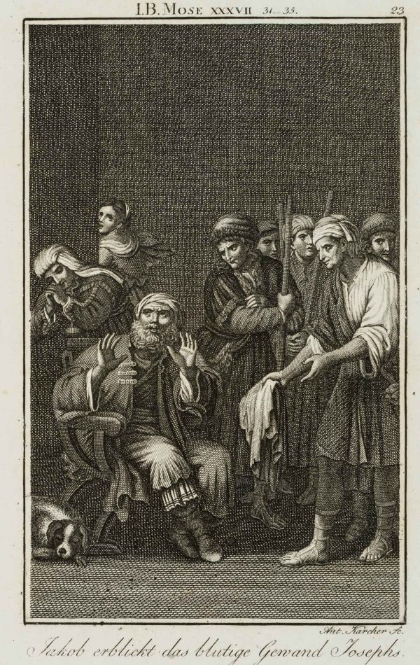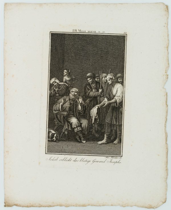 - Description: Shows a scenic depiction with the sons of Jacob telling their father about the alleged death of their favourite son. Illustration of the biblical passage Book of Moses 37, 31-35. The illustration is taken from Die Heiligen Schriften des Alten Testaments in Hundert Biblischen Kupfern dargestellt | Gestochen unter der Leitung von Carl Schuler | Freiburg in der Herder’sche Kunst und Buchhandlung, published around 1820. Inscribed above and below the illustration in the printing plate.
