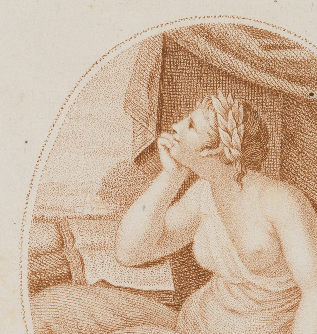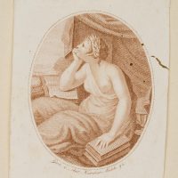 - Description: Antique portrait of a young woman with laurel wreath and books in a high oval.