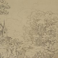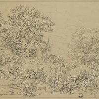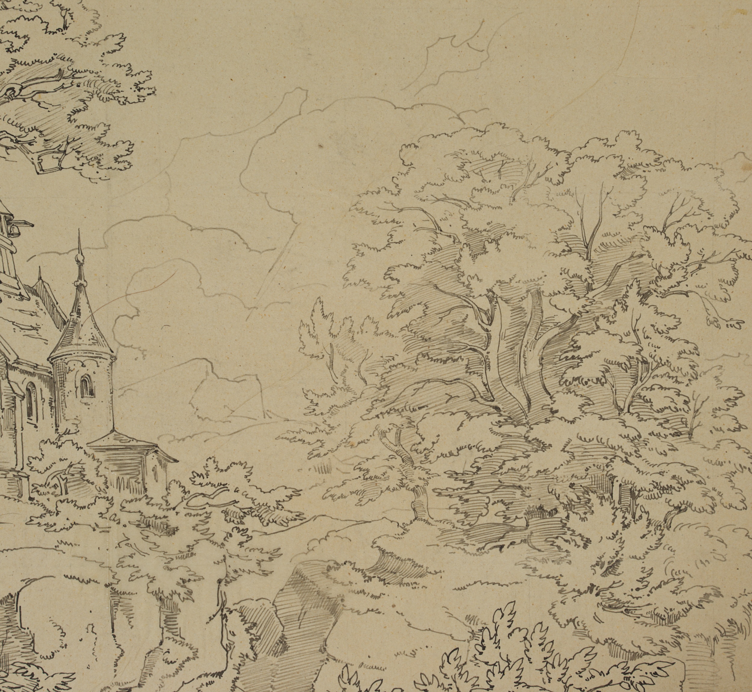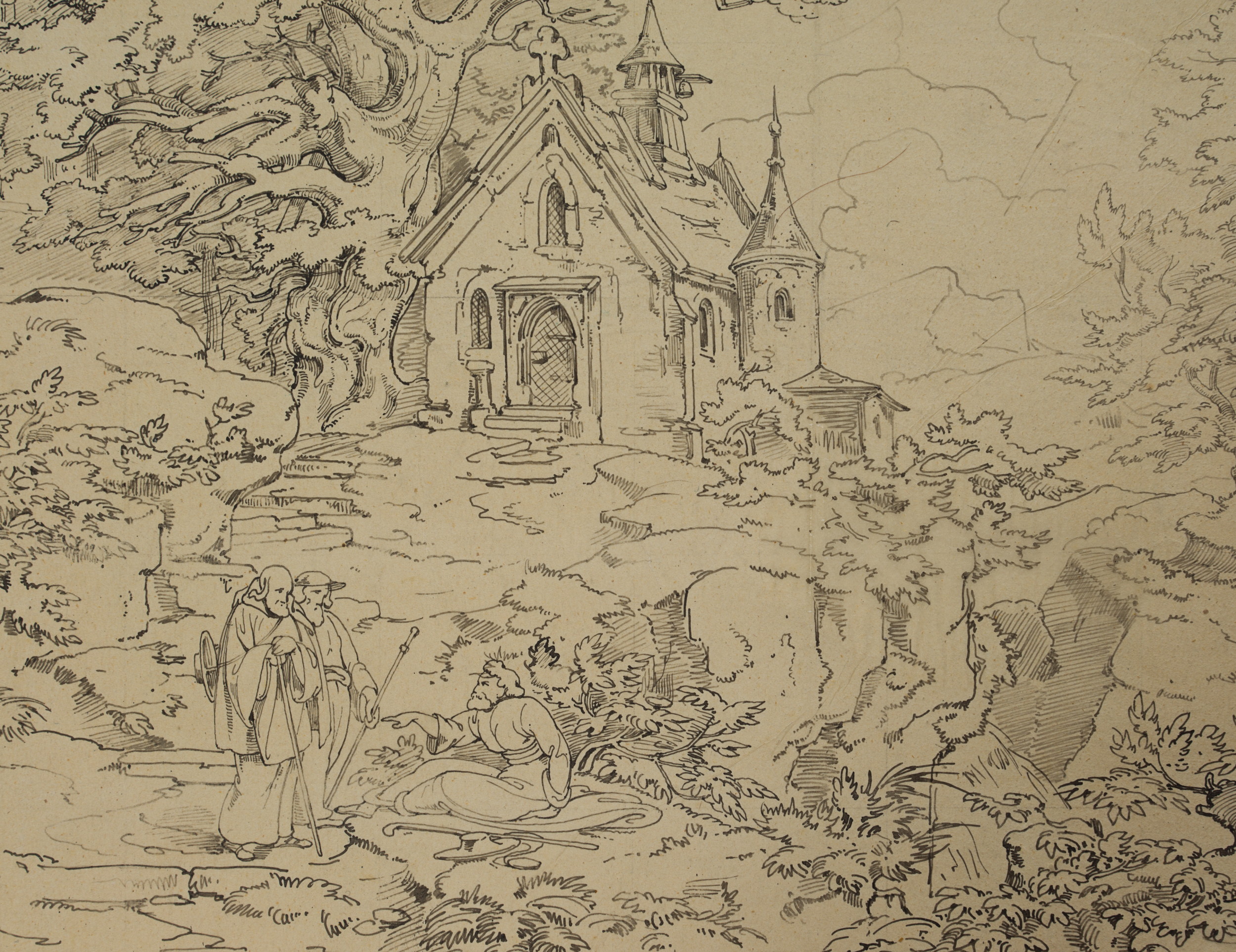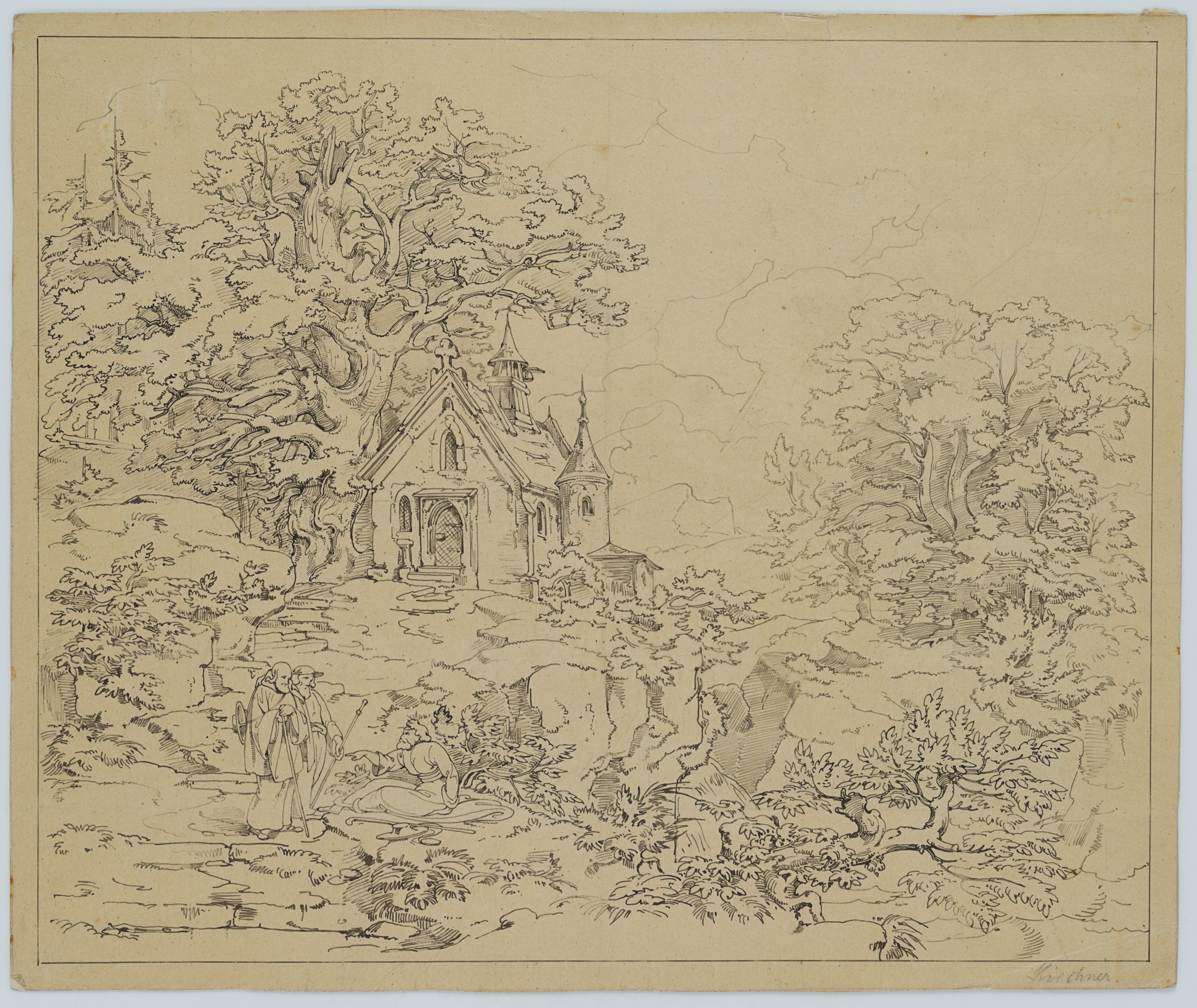 Albert Emil Kirchner (1813 Leipzig – 1885 Munich), Mountain landscape with chapel and three pilgrims, c. 1840, Pen drawing