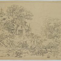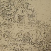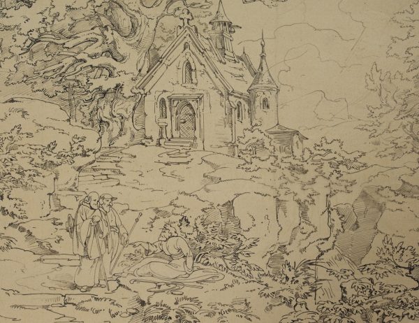 - Description: Typical Nazarene romantic composition with forest chapel and three pilgrims.