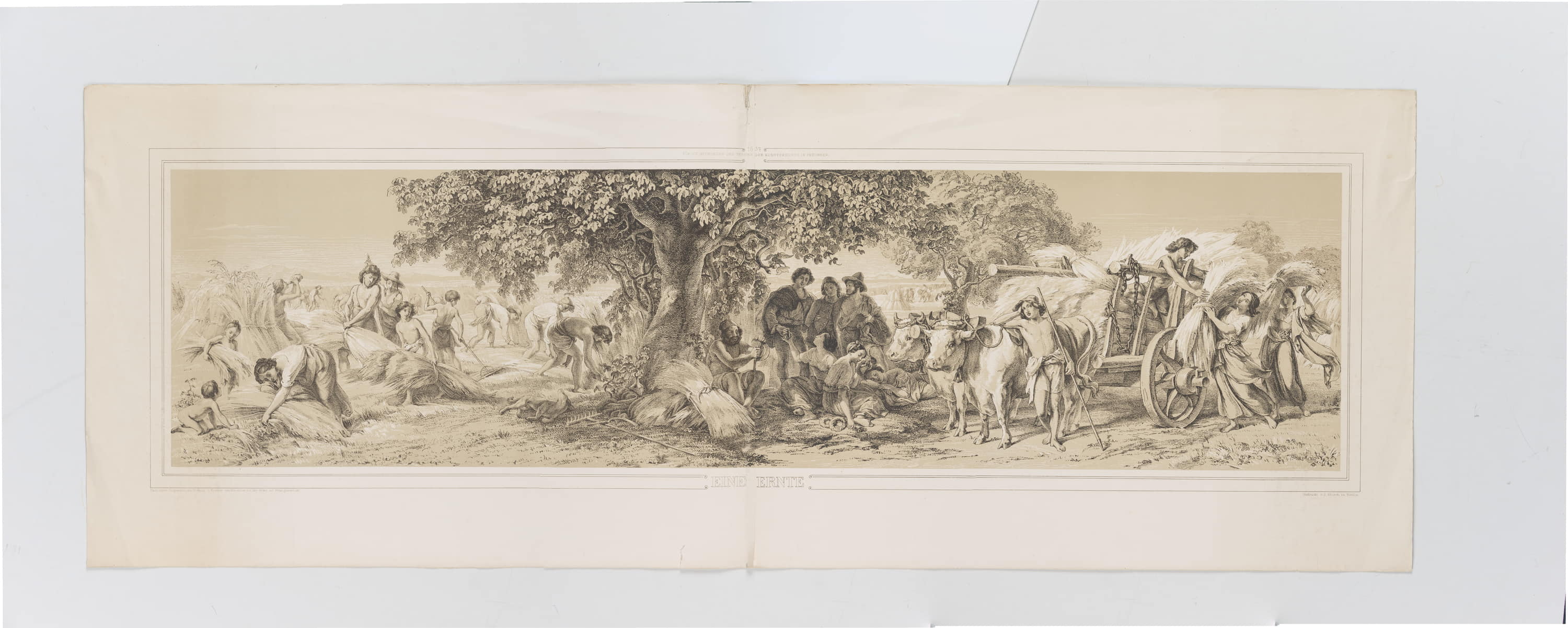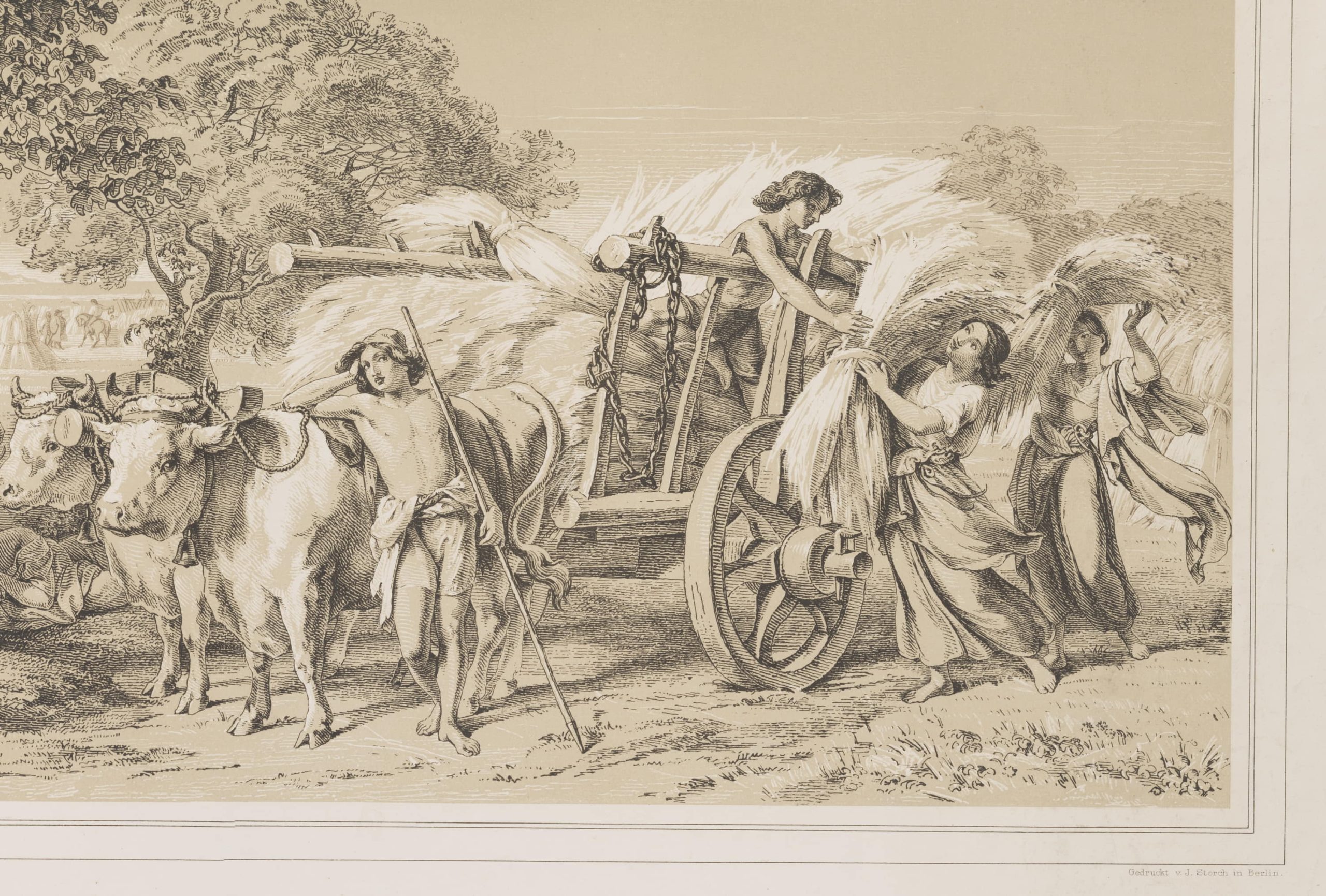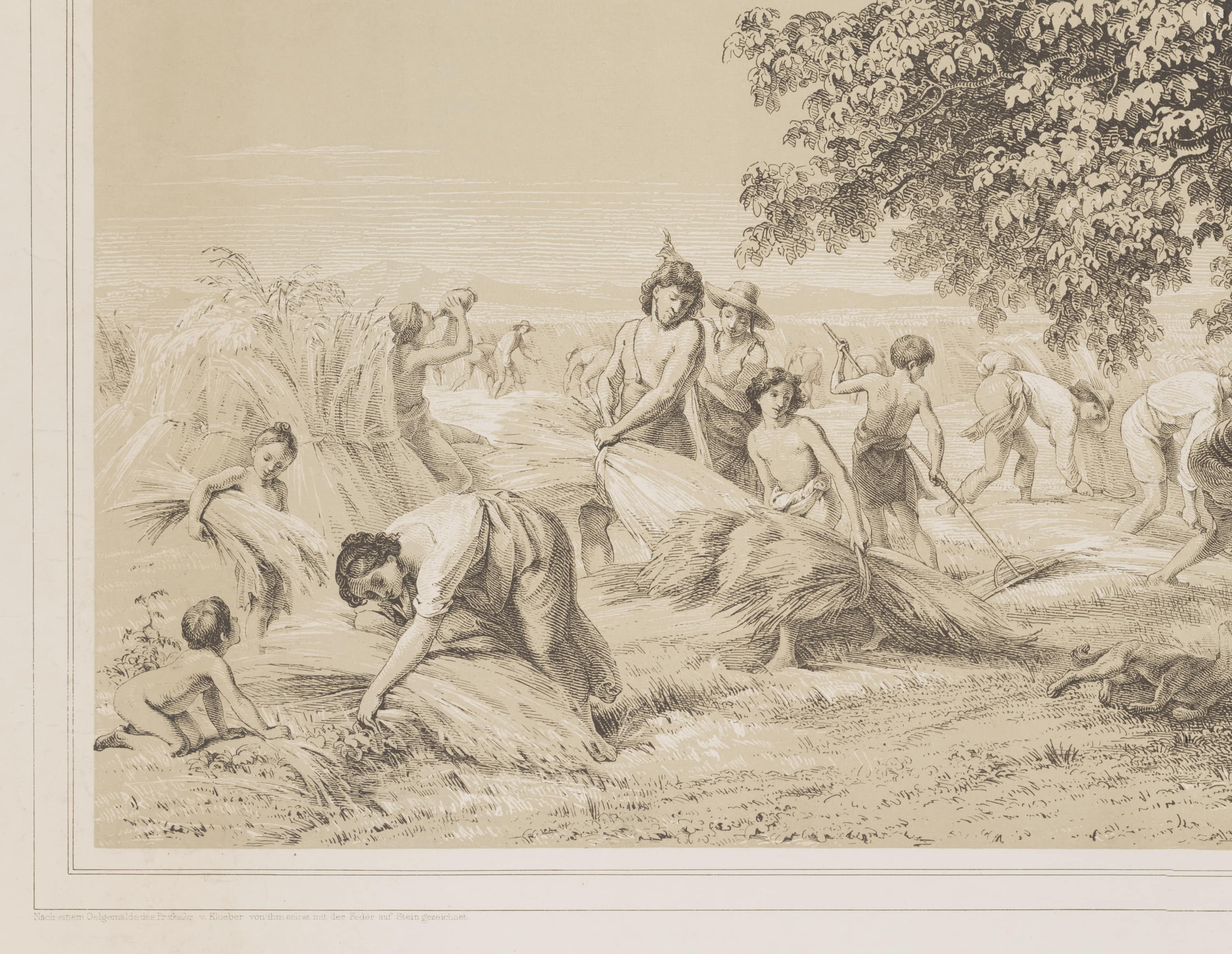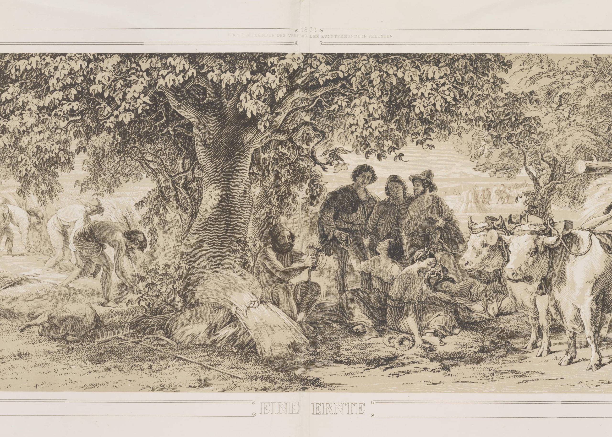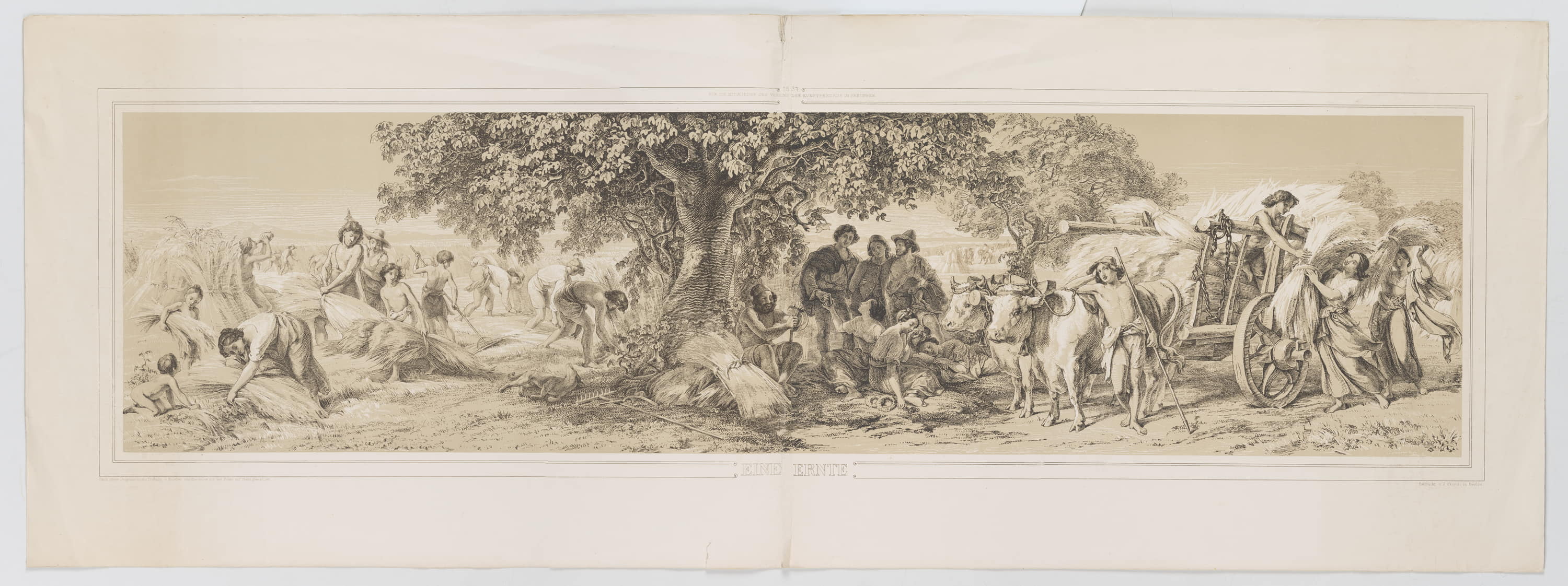 • Bezeichnung: Unterhalb der Darstellung im Stein signiert und bezeichnet: “Nach einem Oelgemälde des Professor v. Kloeber von ihm selbst mit der Feder auf Stein gezeichnet. | Gedruckt v. J. Storch in Berlin. | Eine Ernte”, oben bezeichnet und datiert:: “Für die Mitglieder des Vereins der Kunstfreunde in Preussen 1837”