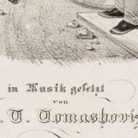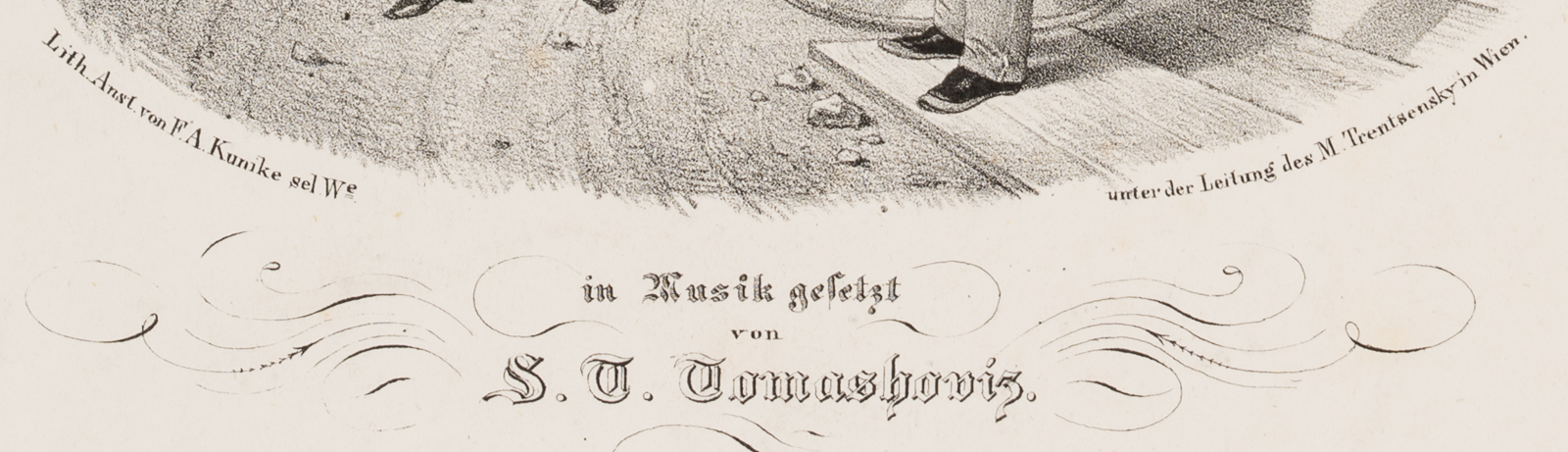 - Description: Titled above, inscribed below with: “in Musik gesetzt von Joseph Thomashoviz”, signed on the left below the print with “Lith. Anst. Von F.A. Kunike sel We” and signed on the right with “unter der Leitung des M. Trentsensky in Wien”. Stamped on the reverse with the letters: “GES”.