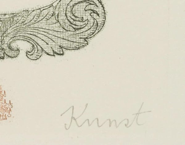 - Bezeichnung: Unten mittig befindet sich ein Randeinfall/Remarque in Form eines Weihnachtsbaumes. Unten rechts vom Künstler in Bleistift signiert.