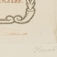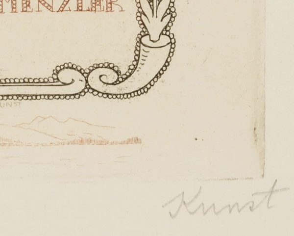 - Bezeichnung: Unten mittig vom Künstler in der Druckplatte signiert. Darunter befindet sich ein Randeinfall/Remarque in Form einer Seelandschaft. Unten rechts vom Künstler in Bleistift signiert.