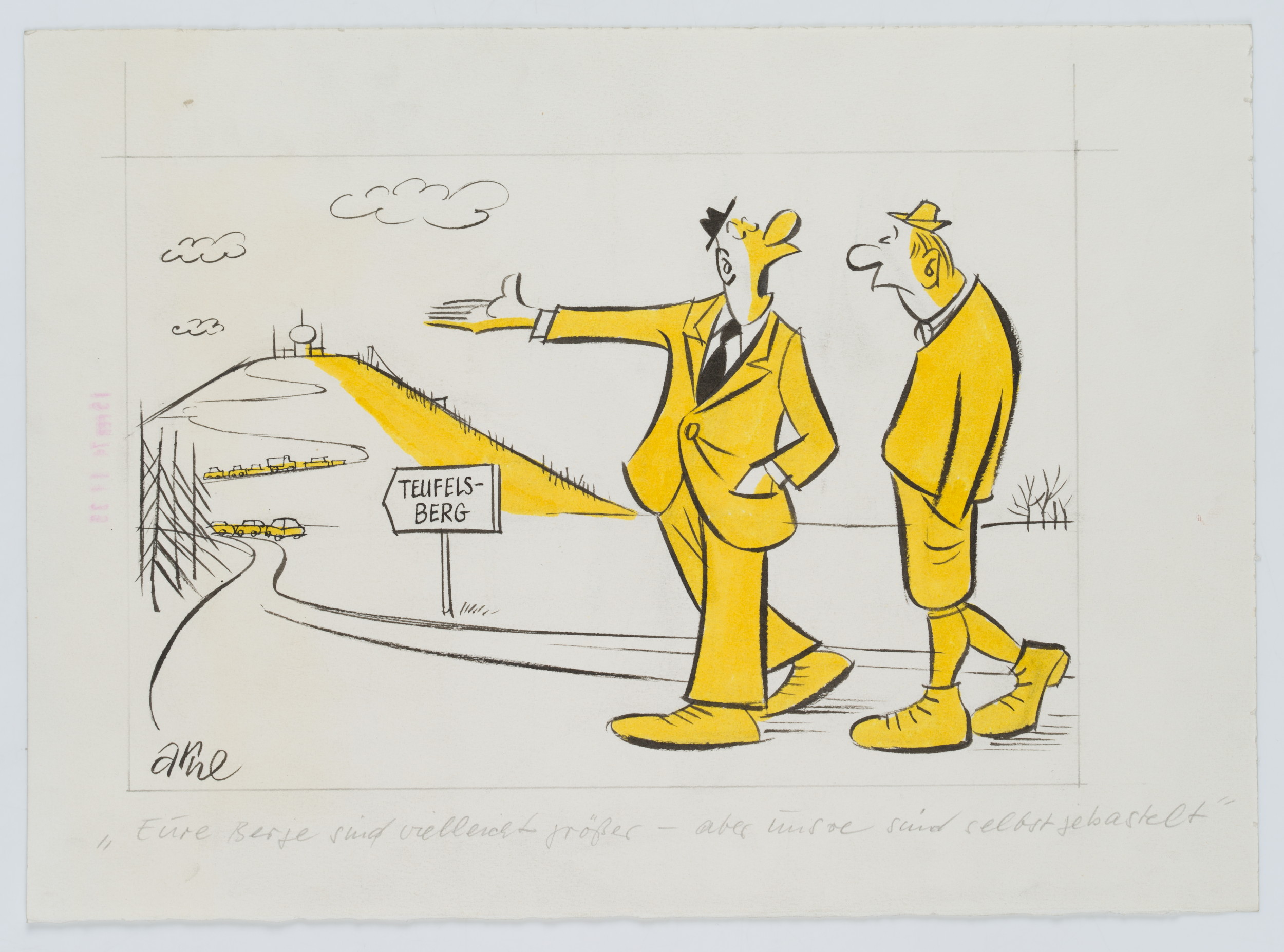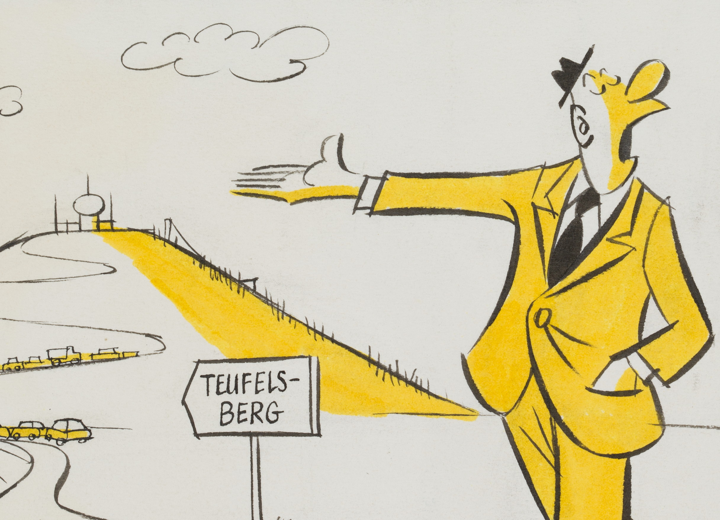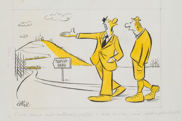 - Beschreibung: Karikatur zum großen Schuttberg, genannt “Teufelsberg” in Berlin, der aus fast einem Drittel des gesamten Schuttes zerstörter Gebäude aus dem Zweiten Weltkrieg besteht.