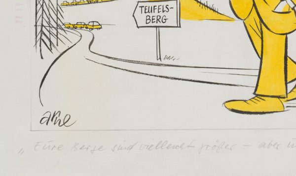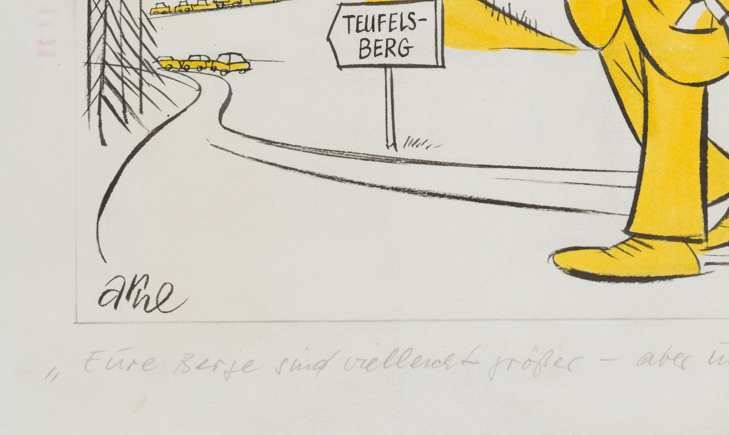 - Inscription: lower left signed: “Arne”. Inscribed by the artist’s hand: “Teufelsberg / ‘Eure Berge sind vielleicht größer – aber unsere sind selbstgebastelt'”. Middle left dated: “15 FEB 70[?] 11 35 [Stempel]”.