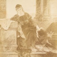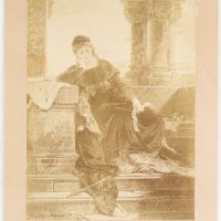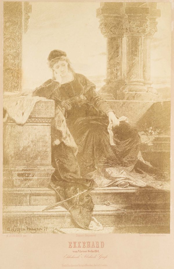 - Beschreibung: Szene aus dem Roman “Ekkehard” von Joseph Victor von Scheffel aus dem Jahr 1855. Darin beschreibt der Autor den Werdegang eines Mönches, Ekkehard, der sich durch ein Liebesabenteuer verwirrt vom Klosterleben abwendet und schließlich Schriftsteller wird. Die Dargestellte, vermutlich die Herzogin Hadwig von Schwaben, sitzt mit trauriger Miene auf einem Mauervorsprung. Ihren Kopf in ihre rechte Hand gestützt, hält sie in ihrer linken ein Schriftband. Vermutlich den benannten Abschiedsgruß Ekkehards.