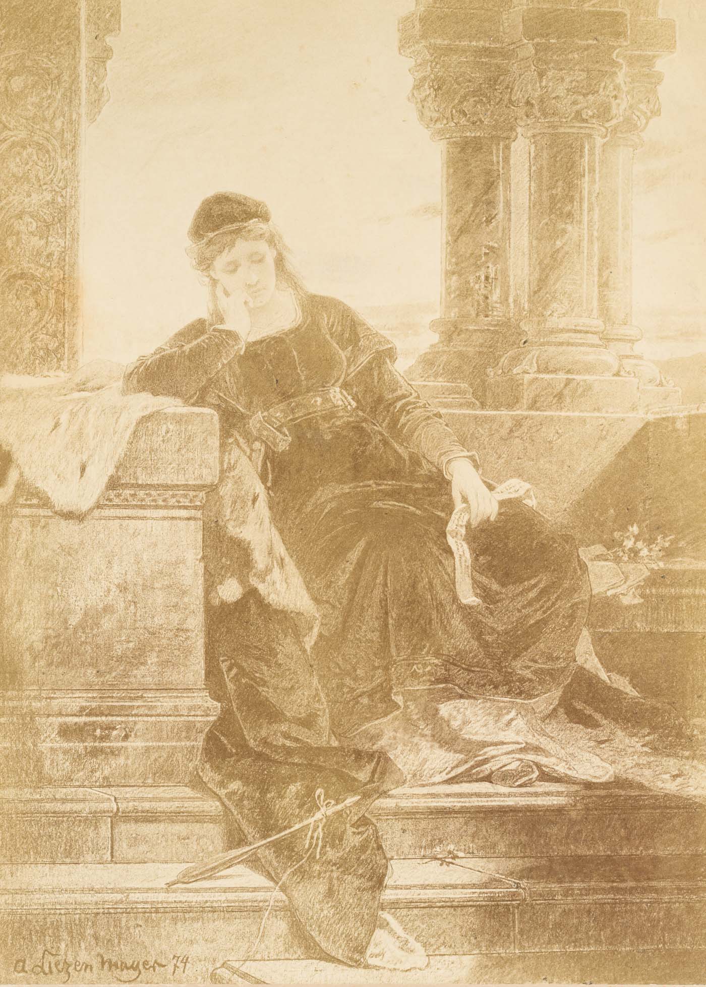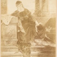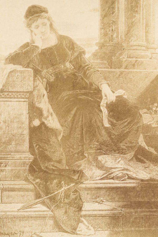 - Description: Scene from the novel “Ekkehard” by Joseph Victor von Scheffel from 1855. In it, the author describes the career of a monk, Ekkehard, who, confused by a love affair, turns away from monastic life and eventually becomes a writer. The sitter, presumably the Duchess Hadwig of Swabia, is sitting on a wall projection with a sad expression. She is holding her head in her right hand and a scroll in her left. Probably the farewell greeting of Ekkehard.