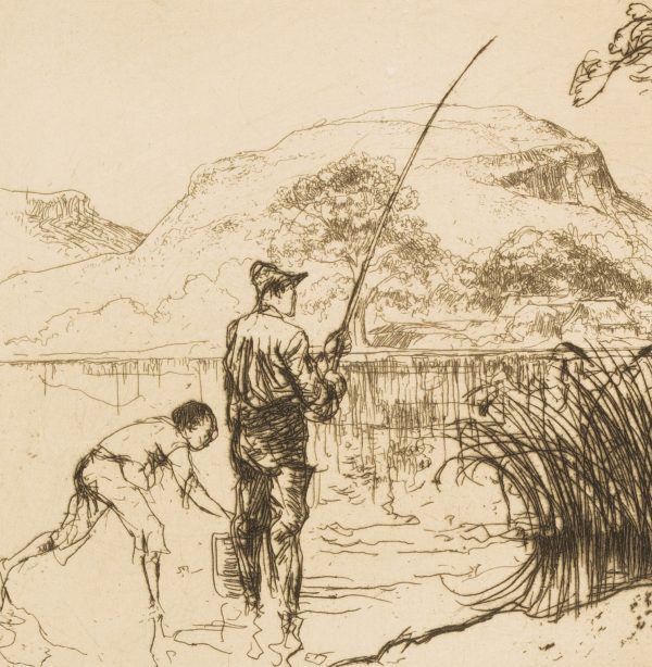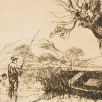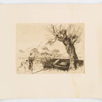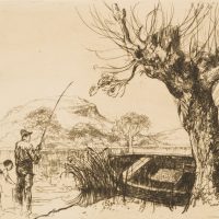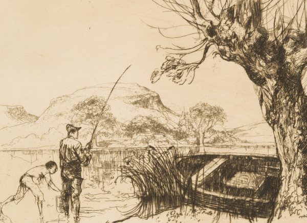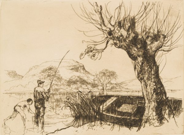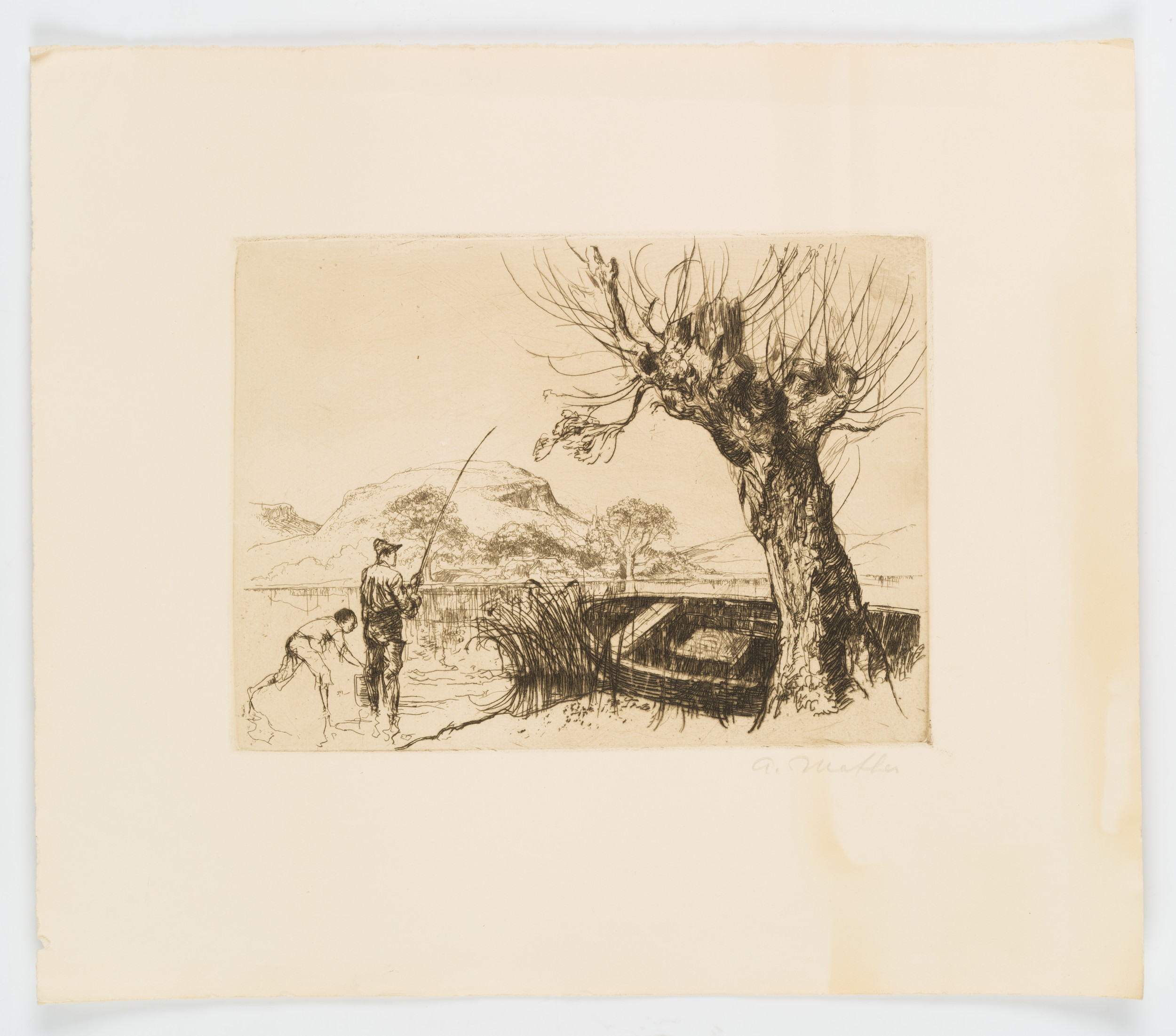 Arvid Mather (1905 Barmen – 1950 Düsseldorf), Knorrige Weide mit zwei Anglern am See, , Kaltnadelradierung