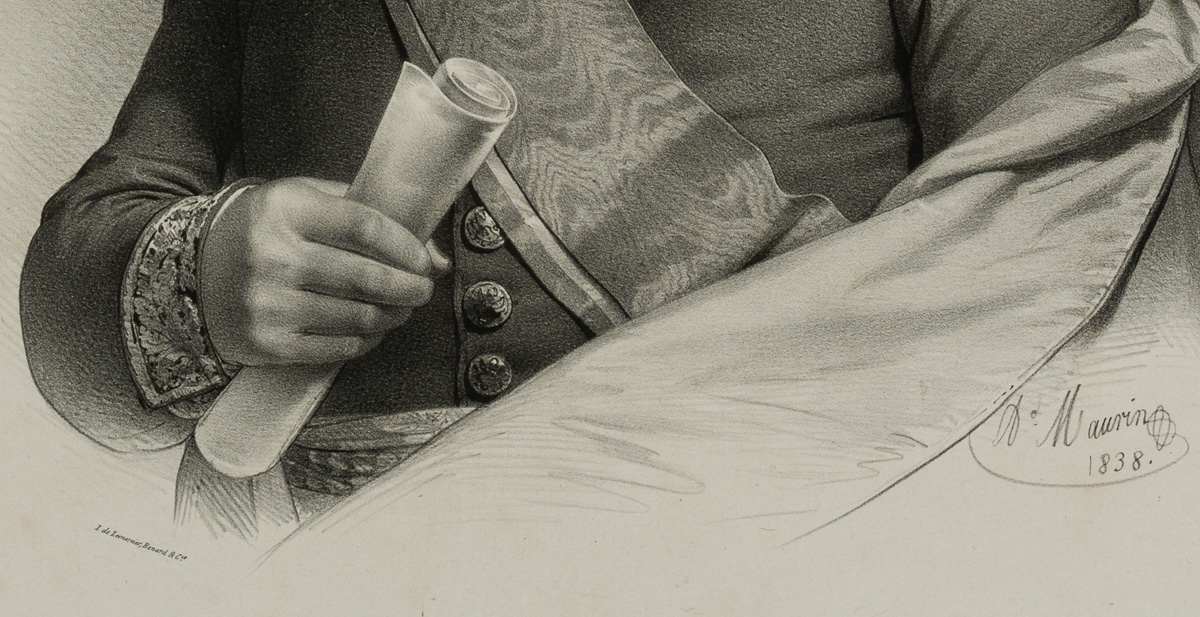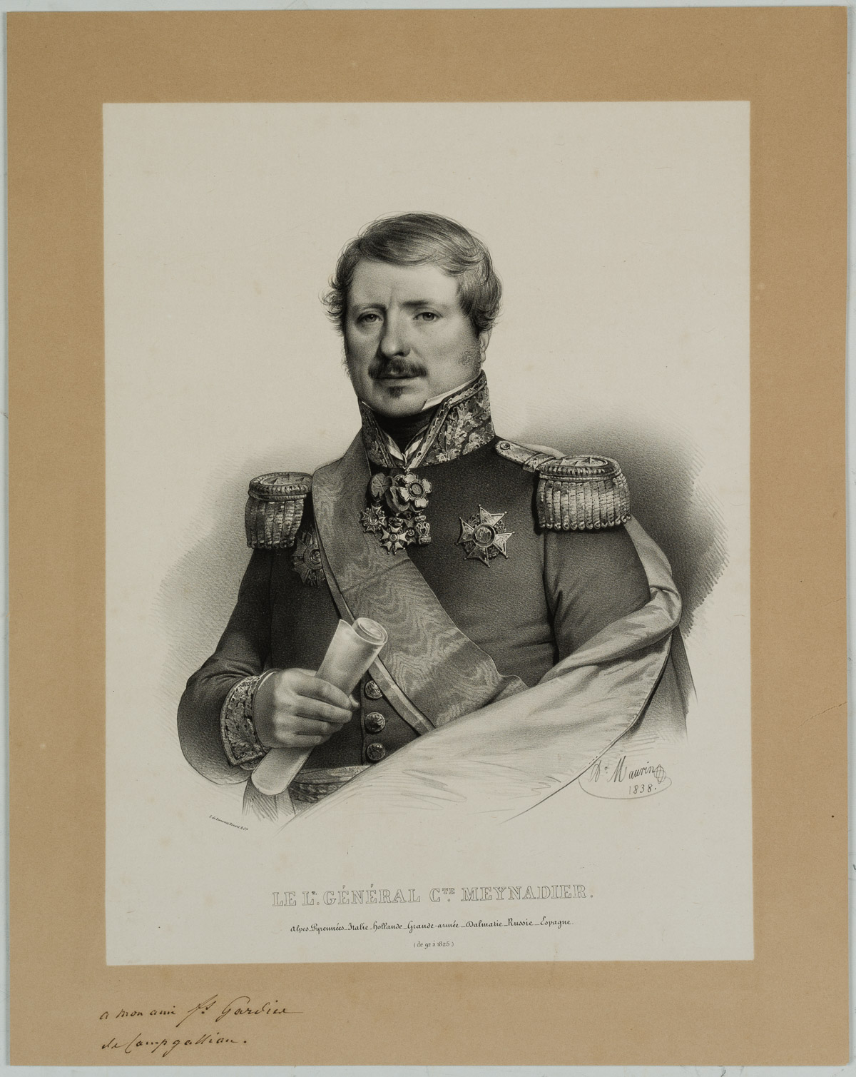 - Bezeichnung: Unten im Druck bezeichnet: “De Maurin 1838”, “Le lt. Général cte. Meynadier”. Unten links weitere Beschriftungen: ” handschriftliche Widmung”.