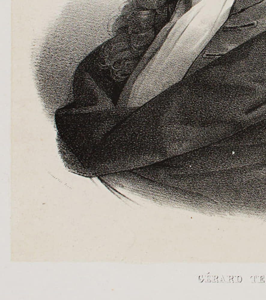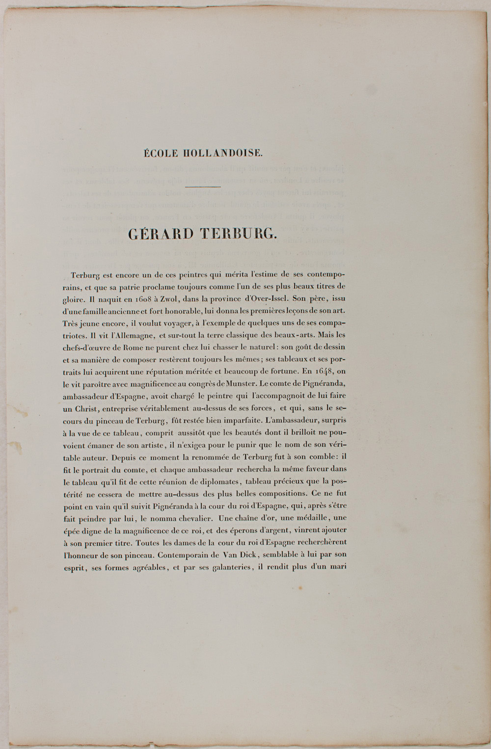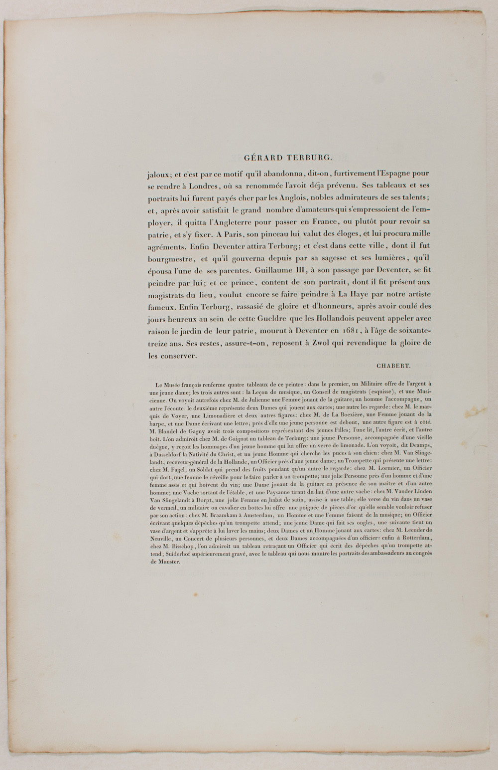 - Description: Portrait of the painter Gerard Terburg (1608 -1681). He was a painter of the Dutch School. Lithograph by Chabert. From the series: Pictures of the Flemish, Dutch and German School (ECOLE FLAMANDE, HOLLANDAISE ET ALLEMANDE). Inscribed: Maurin fecit. lmp. lithog. de Chabert, rue Cassette, N°. 20. title: GERARD TERBURG. separate text sheet (In French, by Chabert) in similar format.