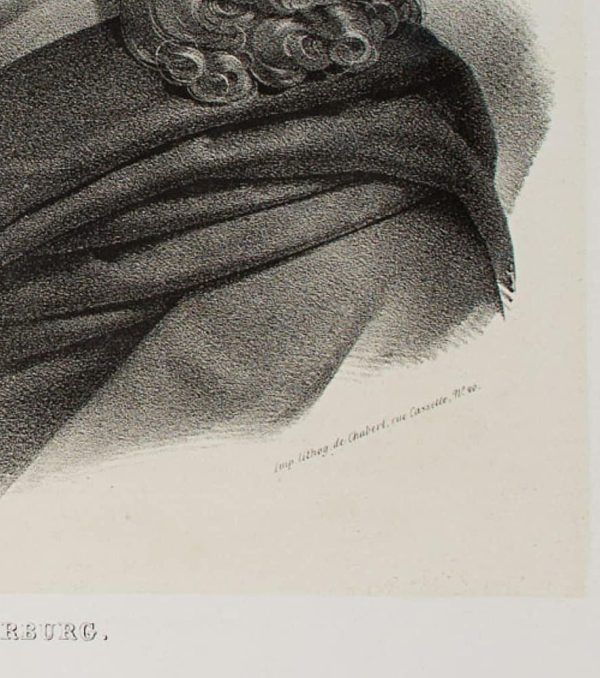 - Beschreibung: Portrait des Malers Gerard Terburg (1608 -1681). Er war Maler der Holländischen Schule. Lithographie von Chabert. Aus der Serie: Bilder der Flämischen, Holländischen und Deutschen Schule (ECOLE FLAMANDE, HOLLANDAISE ET ALLEMANDE). Bezeichnet: Maurin fecit. lmp. lithog. de Chabert, rue Cassette, N°. 20. Titel: GERARD TERBURG. Separates Textblatt (In französischer Sprache, von Chabert) im ähnlichen Format.