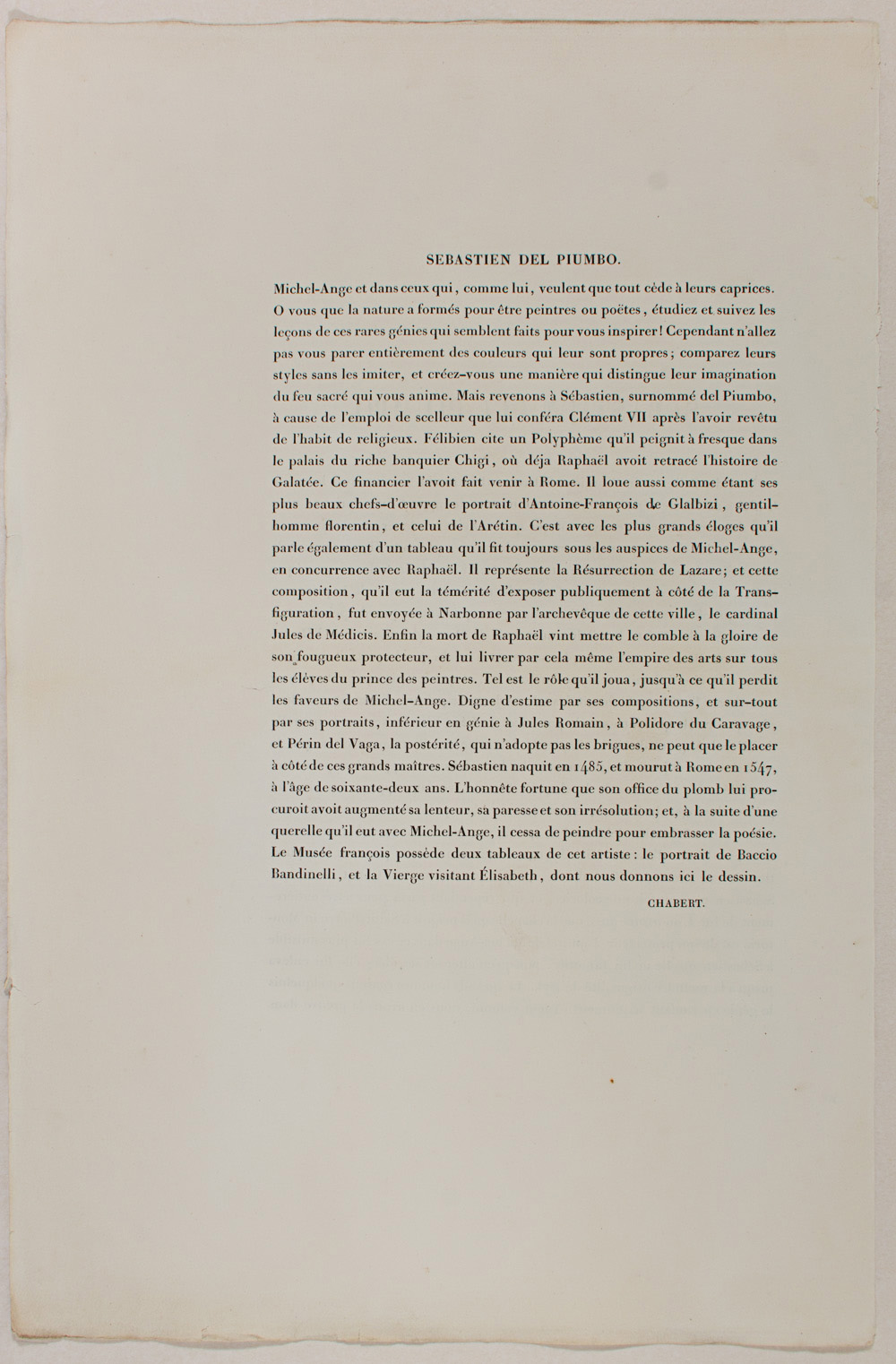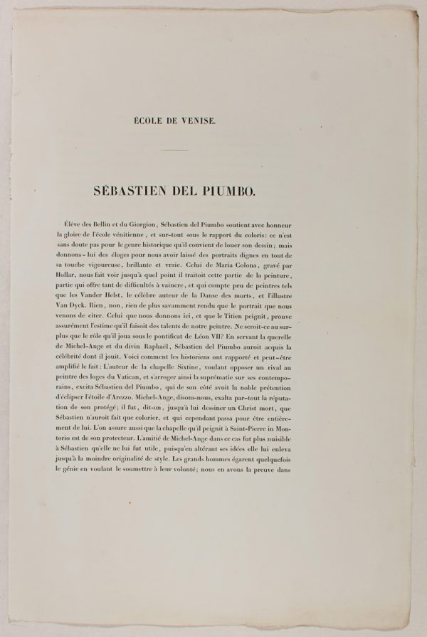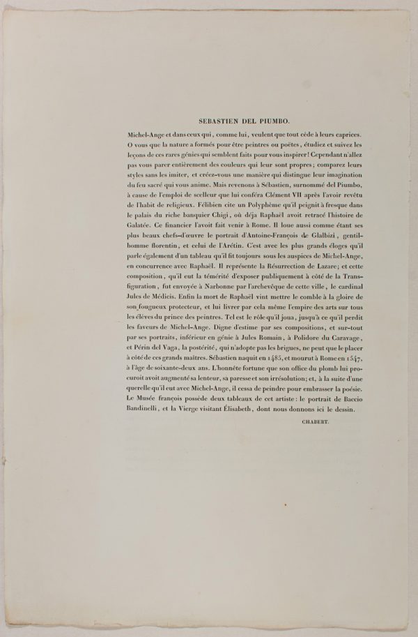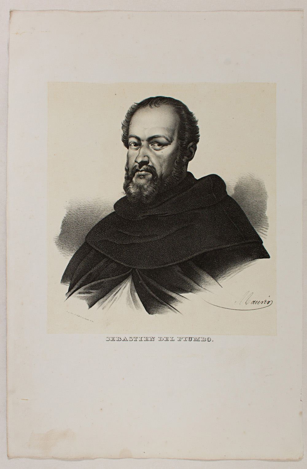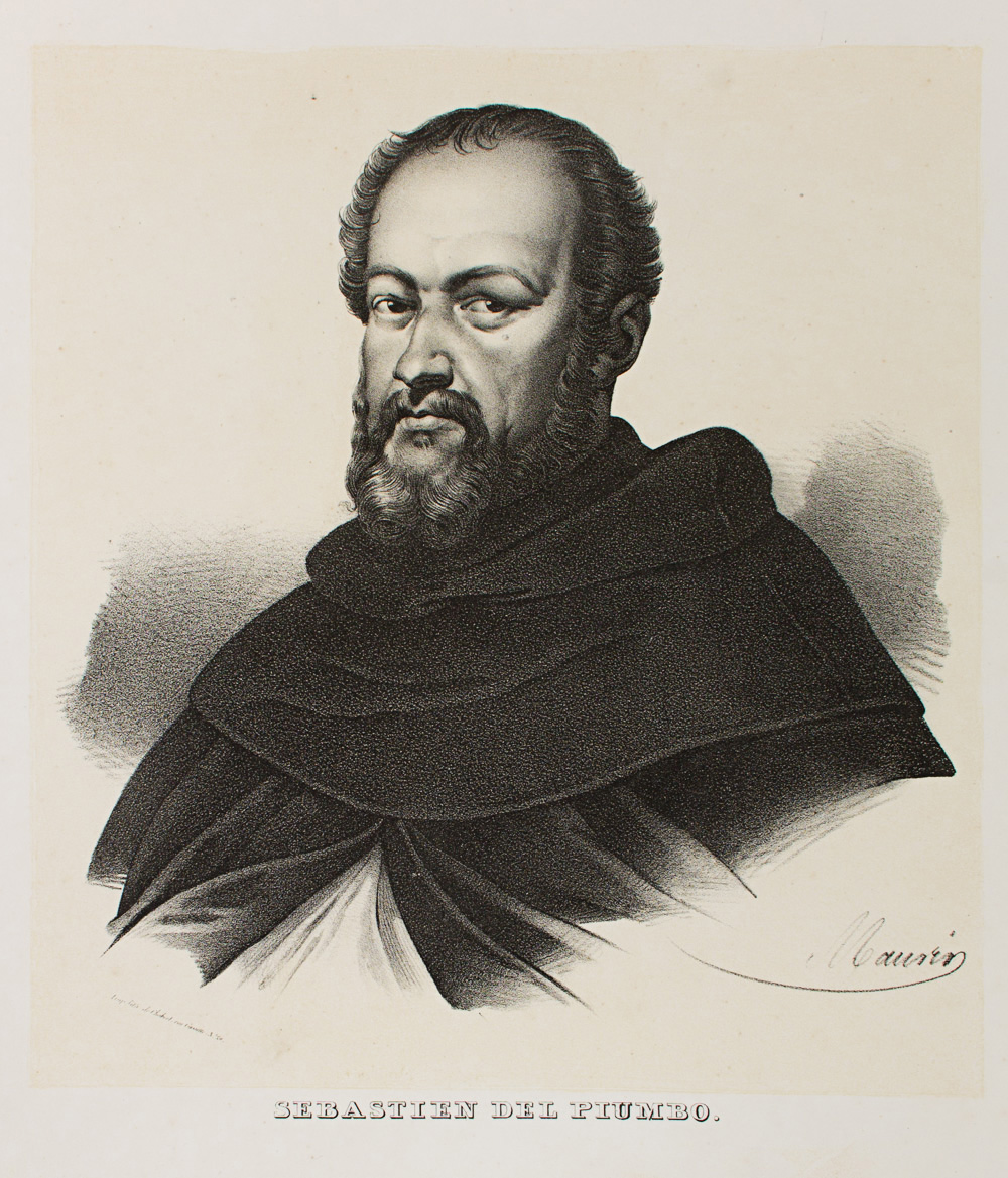 - Description: Portrait: Sebastian del Piombo (1485 – 1547), pupil of Bellin and Giorgion. Painter of the Romanesque School. Colour lithograph. Inscribed: SEBASTIAN DEL PIUMBO lmp. lith. de Chabert. Signed: Maurin. Separate text information (In French by Chabert.
