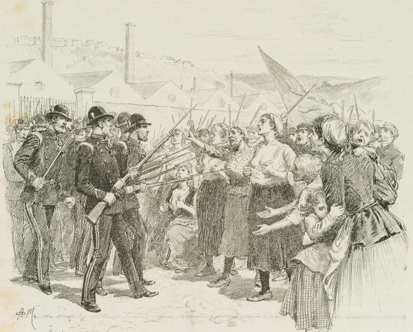 Adolph Friedrich Erdmann von Menzel (1815 Breslau – 1905 Berlin), Das Aufbegehren der Frauen der belgischen Bergarbeiter, 19. Jahrhundert, Holzstich