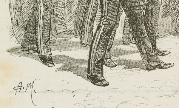 - Beschreibung: bezeichnet “A.M.”, betitelt “A la Verrerie Casimir Lambert. – Les Femmes des Mineurs se jettent entre les artilleurs de la Garde Civique de Charleroi et le Émeutiers.” Adolph Menzel ist als gefeierter Künstler großer Gemälde und bedeutender Historienmaler des 19. Jahrhunderts berühmt. Kaum bekannt ist jedoch, dass er auch ein reiches druckgrafisches Werk hinterlassen hat, da er sich lange als Illustrator für Literatur und Zeitschriften betätigt hat. Das Blatt zeigt eine Szene während des belgischen Arbeiteraufstands der 1880er Jahre. Nach massiven Entlassungen hatten zunächst die Berarbeiter von Charleroi einen Aufstand geprobt, der Protest weitete sich jedoch auch auf weitere Industriezweige aus, so auch auf die Glashütten. Die dargestellte Szene zeigt die Frauen der Bergarbeiter vor der Glasfabrik Casimir Lamberts in Charleroi, die sich zwischen die Artilleristen und die Aufständigen, die “Aufrührer” gestellt haben.