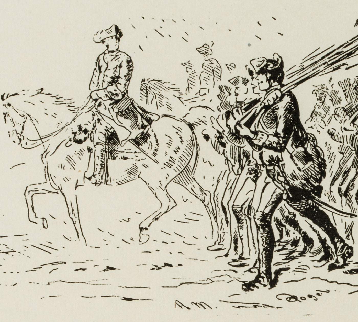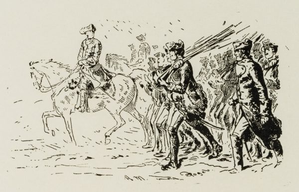 - Description: Illustration from the multi-volume work on the history of Frederick the Great, written by Franz KUGLER (1808 Stettin-1858 Berlin). The depiction shows the King of Prussia on horseback, followed by soldiers in uniform and with rifles.