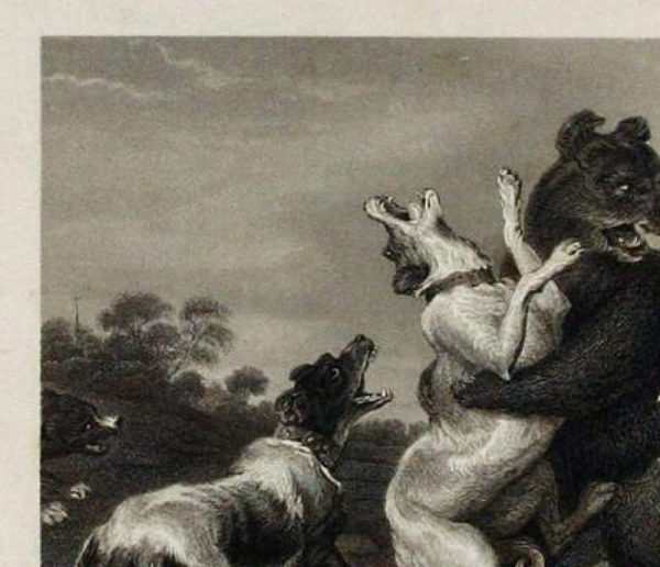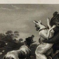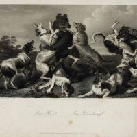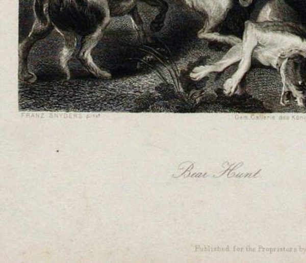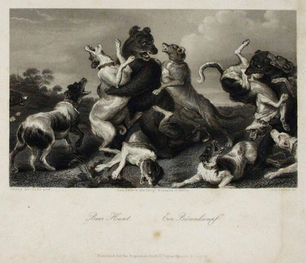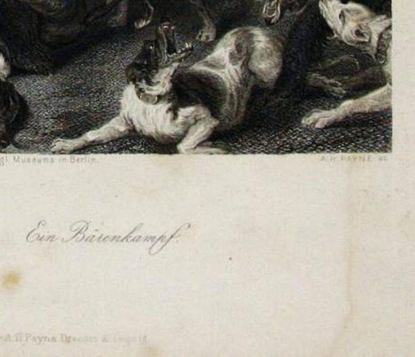- Description: Steel engraving by Albert Heinrich Payne, inscribed: „Franz Snyders pinx. A. H. Payne sc. Bear Hunt. A Bear Fight Gallery of the Royal Museum in Berlin. Published for the Proprietors by A. H. Payne, Dresden & Leipzig.“ Very high quality steel engraving of bear fight after Snyders. A pack of dogs attacks two bears, which know how to defend themselves grimly – even their superior strength seems to be unable to harm the bears. Albert Heinrich Payne (London 1812 – Leipzig 1902) was a steel and copper engraver, etcher, painter and illustrator. From 1838 Payne was a publisher in Leipzig and Dresden. Around 1850 he published the „Dresdner Gemäldegalerie. Old Masters“ with 126 steel engravings.