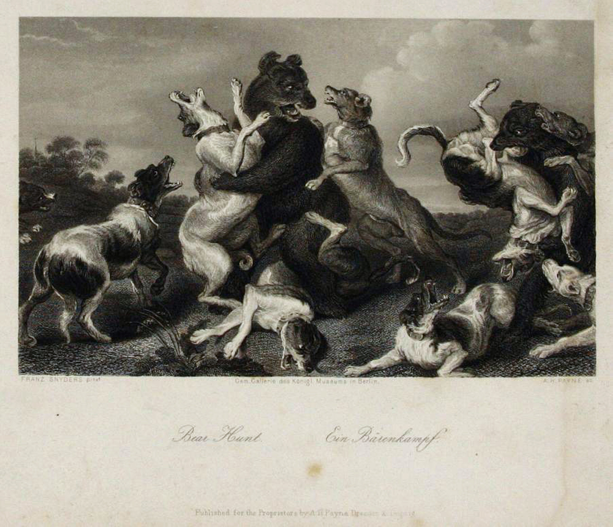 - Beschreibung: Stahlstich von Albert Heinrich Payne, bezeichnet: „Franz Snyders pinx. A. H. Payne sc. Bear Hunt. Ein Bärenkampf Gem. Galerie des Königl. Museums in Berlin. Published for the Proprietors by A. H. Payne, Dresden & Leipzig.“ Sehr qualitätsvoller Stahlstich des Bärenkampfes nach Snyders. Eine Hundemeute greift zwei Bären an, die sich grimmig zu verteidigen wissen auch ihre Übermacht scheint den Bären nichts anhaben zu können. Albert Heinrich Payne (London 1812 – Leipzig 1902) war Stahl- und Kupferstecher, Radierer, Maler und Illustrator. Ab 1838 war Payne Verleger in Leipzig und Dresden. Um 1850 gab er die „Dresdner Gemäldegalerie. Alte Meister“ mit 126 Stahlstichen heraus.