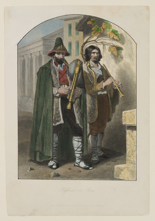 - Beschreibung: 2 Pifferaris ziehen durch die Straßen Roms. So wurden die Hirten aus der Capagna geanntn, die um die Weihnachtszeit nach Rom kamen und dort vor den Marien-Bildern musizierten. Sie waren ein fester Bestandteil des römischen Volkslebens, sind oft beschrieben und bildlich festgehalten worden.