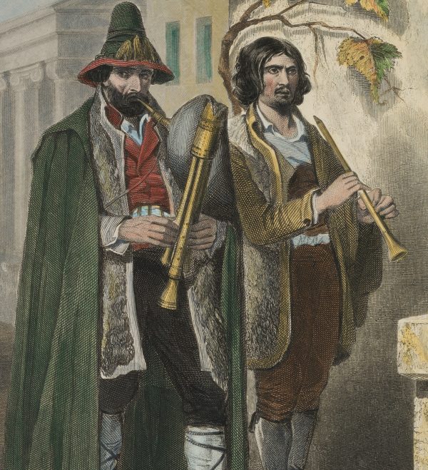 - Description: 2 Pifferaris parade through the streets of Rome. This was the name given to the shepherds from Capagna who came to Rome around Christmas time and played music in front of the images of the Virgin Mary. They were an integral part of Roman folk life and have often been described and pictured.