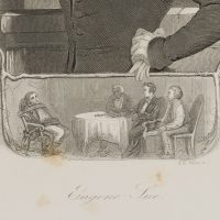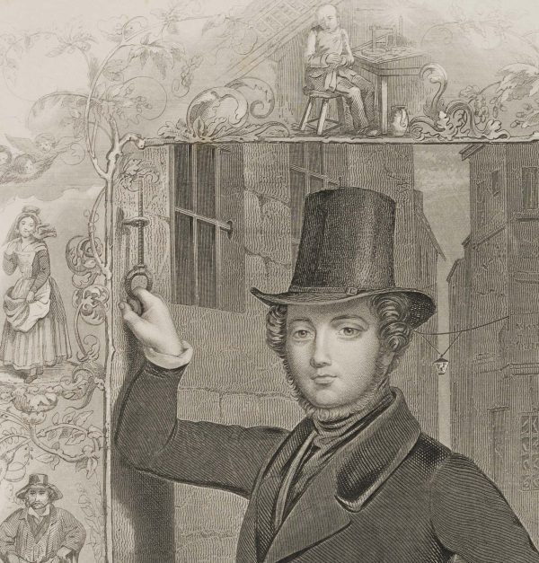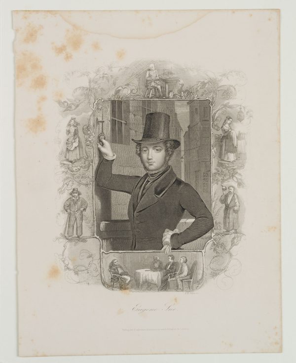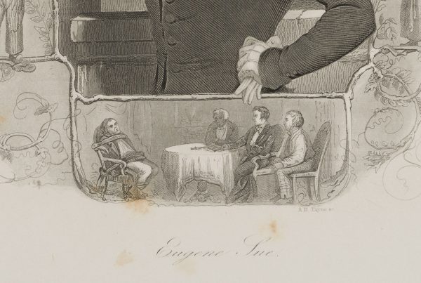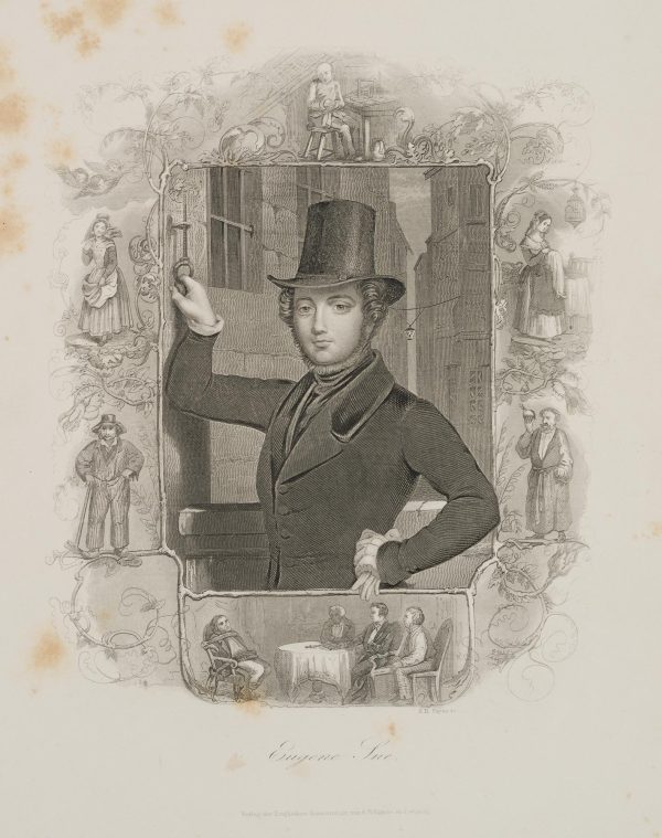 - Description: Steel engraving by Albert Henry Payne, signed and inscribed below the image: “A. H. Payne sc. // Eugene Sue // Verlag der Englischen Kunstanstalt von A. H. Payne in Leipzig”. Very fine bust portrait of Eugène Sue. Self-confidently the young Sue leans his left arm on his hip and looks at the viewer, with his right hand he pulls a doorbell. He wears a black skirt with a top hat, behind him are tall houses in an alley in the dark of night. Small scenes, separated by vines and foliage, frame Sue’s portrait. Eugène Sue (Paris 1804 – Annecy 1857) was a French writer. Almost forgotten today, Sue was one of the most widely read authors in France during his lifetime. He went down in literary history with his serial novels in daily newspapers and was the author of the successful newspaper novel “Les mystères de Paris” (The Mysteries of Paris, 1814). Insel Verlag published this novel as a complete edition in 2 parts in 2008. Albert Henry Payne (London 1812 – Leipzig 1902) was a reproduction engraver, painter and illustrator.