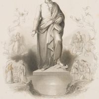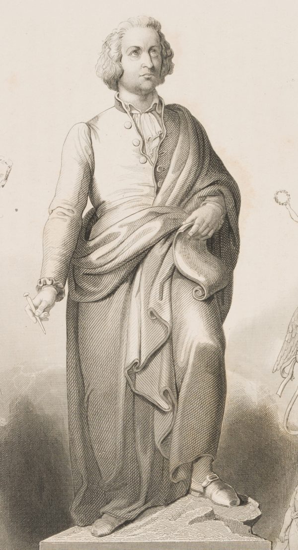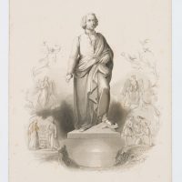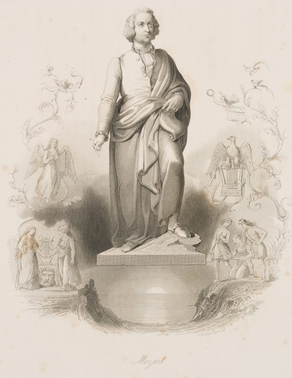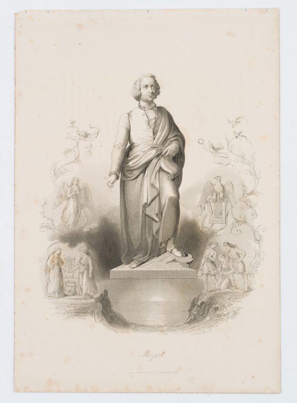 Albert Henry Payne (1812 London – 1902 Leipzig), Full-length heroic portrait after the Mozart Monument in Salzburg, surrounded by allegorical scenes, 1842, Steel engraving